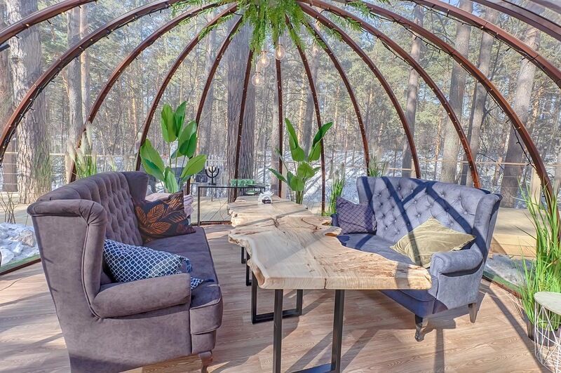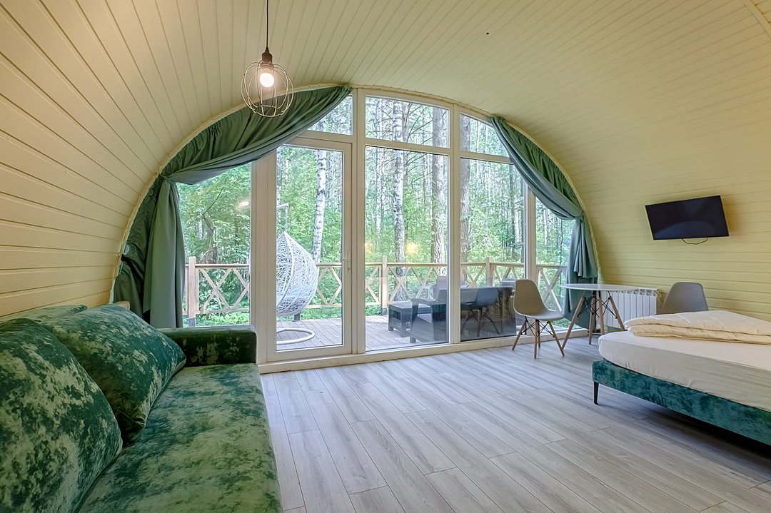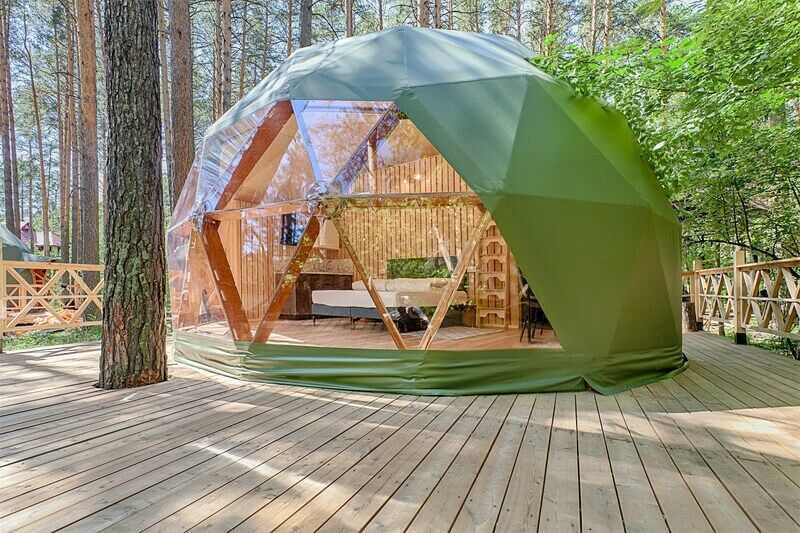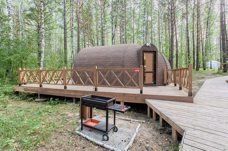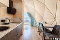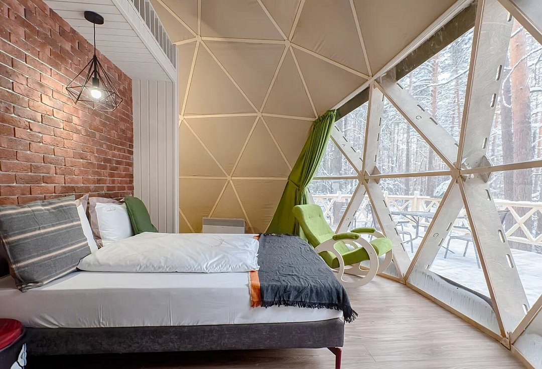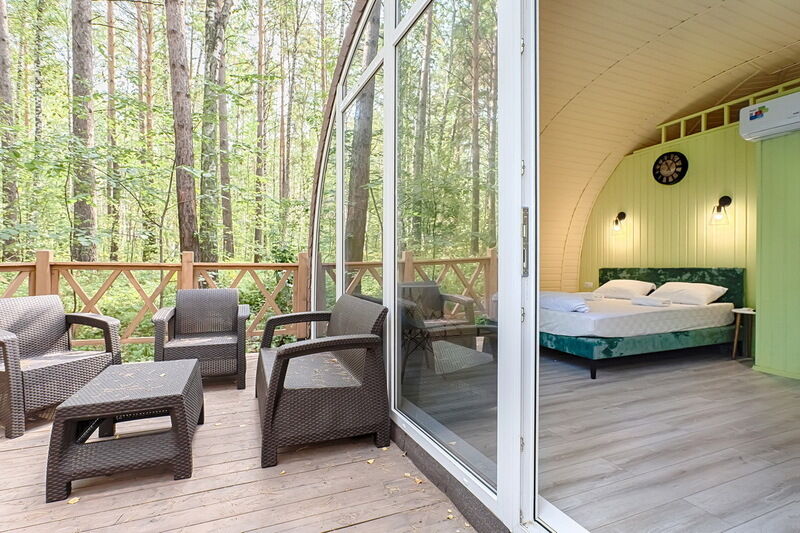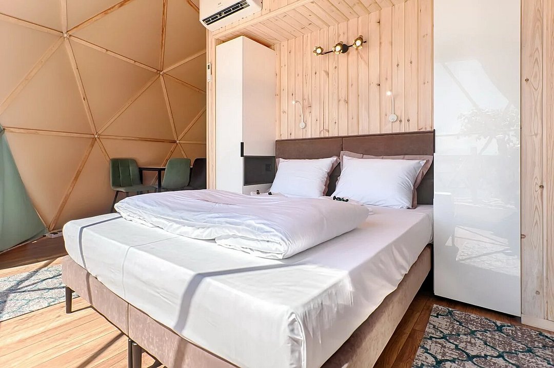 Купольный дом с панорамными окнами. Двуспальная кровать на первом этаже, 2 спальных места на втором полуэтаже, телевизор. Кухонная зона: чайник, микроволновая печь или варочная панель, набор посуды, мини-холодильник. Кондиционер, санузел с душевой кабиной и всеми необходимыми принадлежностями (фен, зубной набор, гель для душа, шампунь, халаты, тапочки). Собственная терраса с мебелью и мангальной зоной.