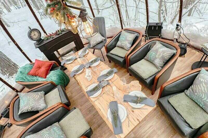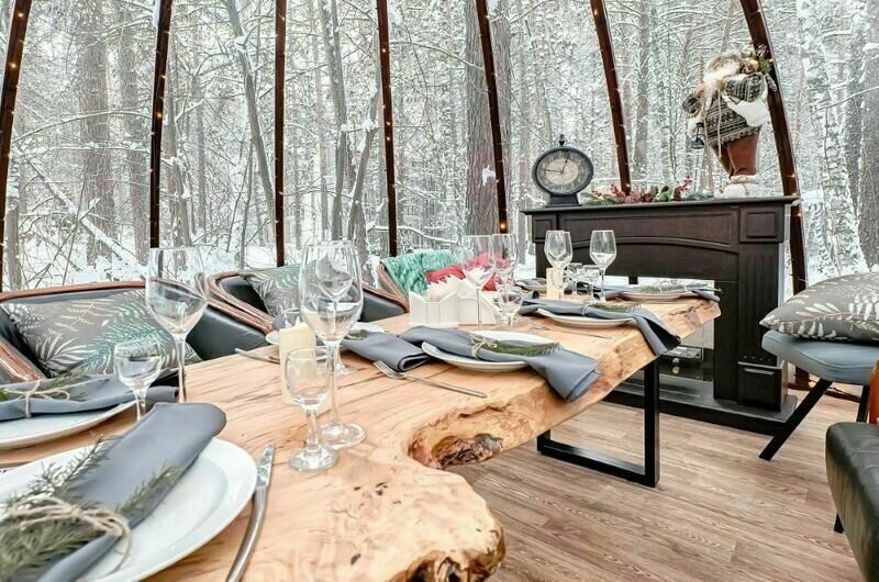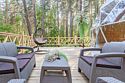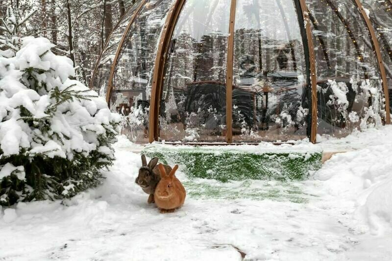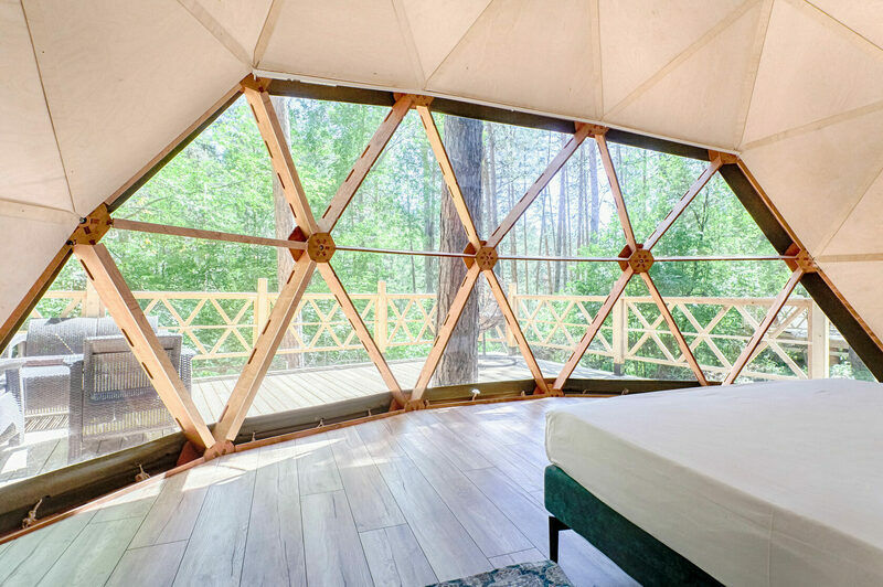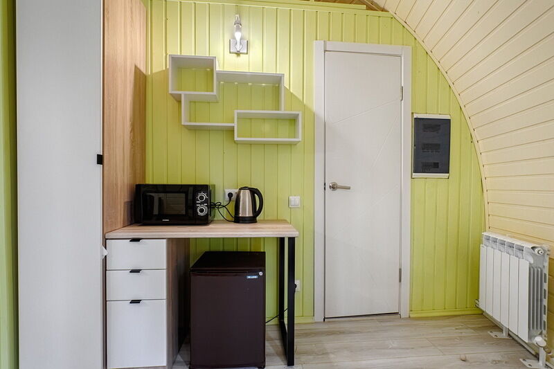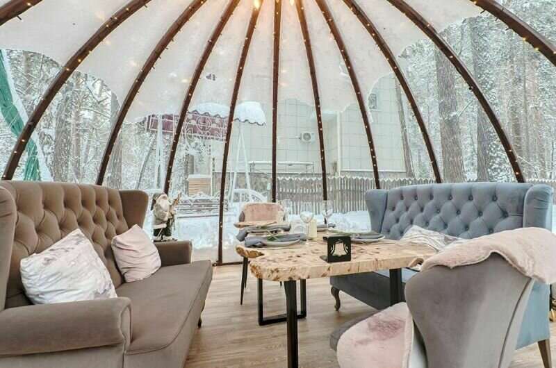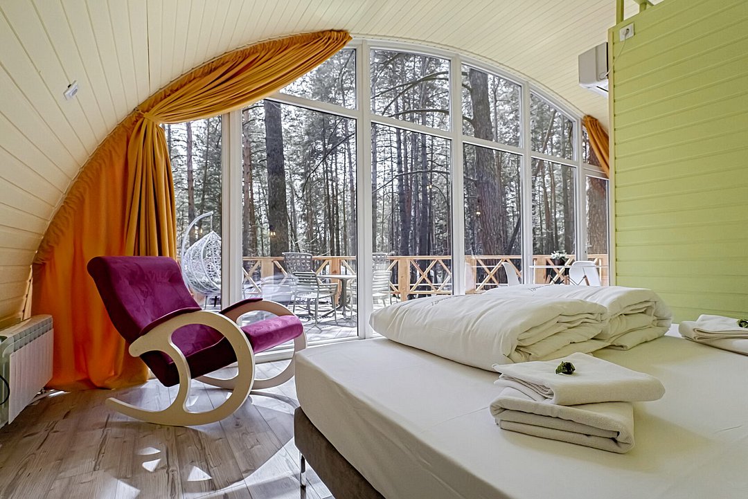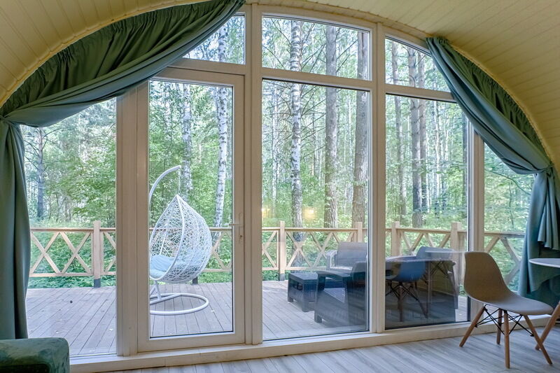 Купольный дом с панорамными окнами. Двуспальная кровать на первом этаже, 2 спальных места на втором полуэтаже, телевизор. Кухонная зона: чайник, микроволновая печь или варочная панель, набор посуды, мини-холодильник. Кондиционер, санузел с душевой кабиной и всеми необходимыми принадлежностями (фен, зубной набор, гель для душа, шампунь, халаты, тапочки). Собственная терраса с мебелью и мангальной зоной.