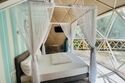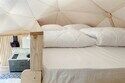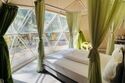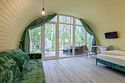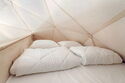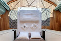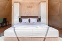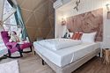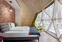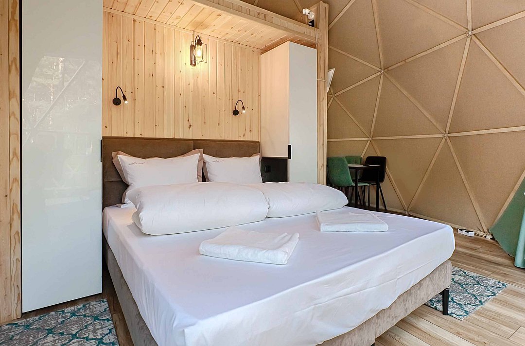 Полусферический дом с панорамной стеной и выходом на собственную большую террасу. Двуспальная кровать, обеденная зона, чайник, микроволновая печь, набор посуды, кондиционер. Санузел с душевой кабиной и всеми необходимыми принадлежностями (фен, зубной набор, гель для душа, шампунь, халаты, тапочки). У дома отдельная зона барбекю.