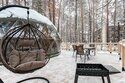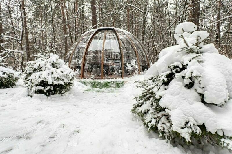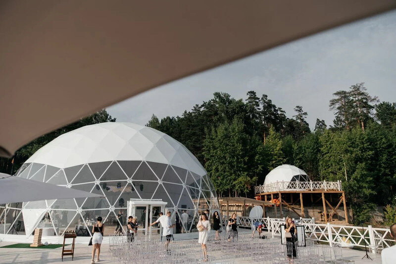 Вместимость сферы до 50 человек. Металлическая конструкция в лесу с панорамными окнами и выходом на берег Бердского залива.