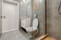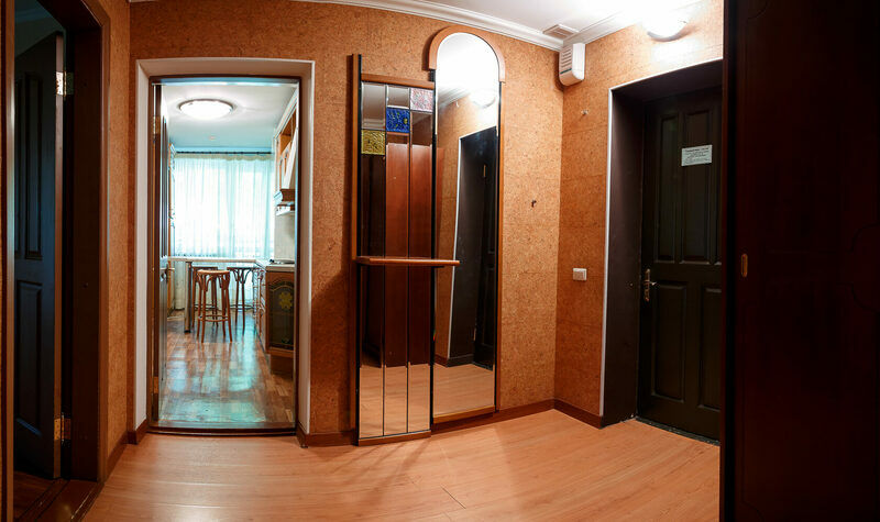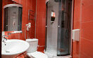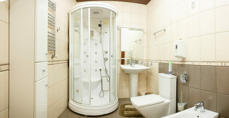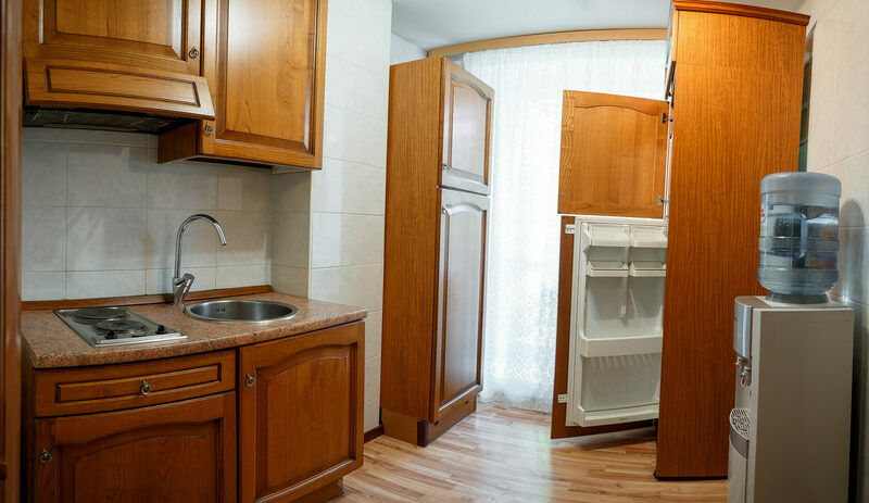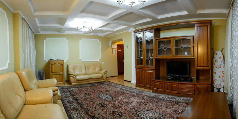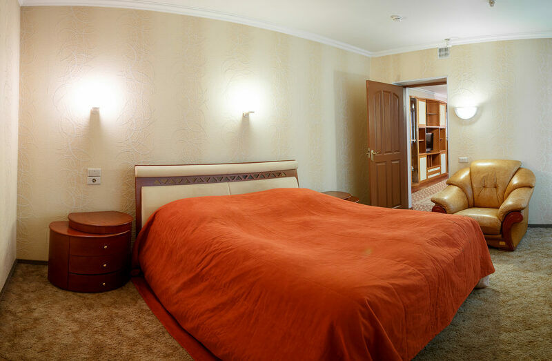Двухкомнатный номер. В спальне двуспальная кровать и шкаф, в гостиной диван, холодильник, телевизор, журнальный столик. Санузел с душевой кабиной и всеми необходимыми принадлежностями (фен, зубной набор, гель для душа, шампунь, тапочки), чайник, набор посуды