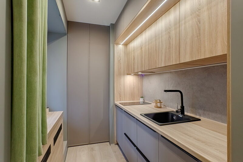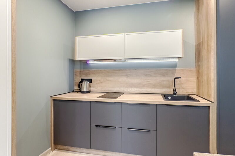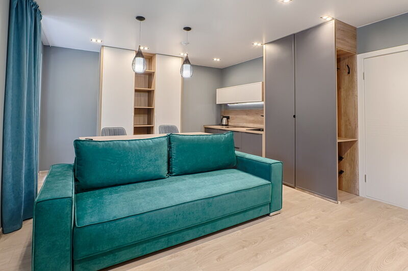 Однокомнатные студии с кухонной зоной и гостиной. В гостиной раскладной диван, телевизор. В кухонной зоне чайник, варочная панель, раковина, кухонные принадлежности. Санузел с душевой кабиной и всеми необходимыми принадлежностями (фен, зубной набор, гель для душа, шампунь, халаты, тапочки).