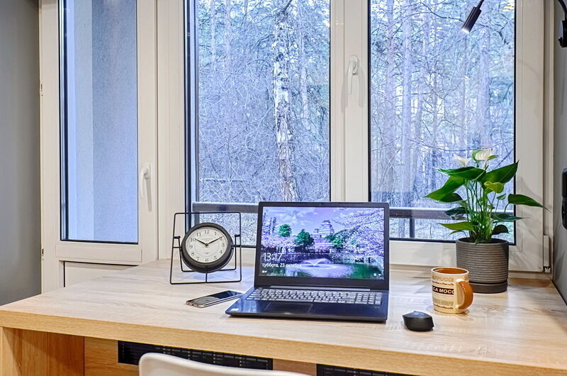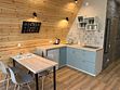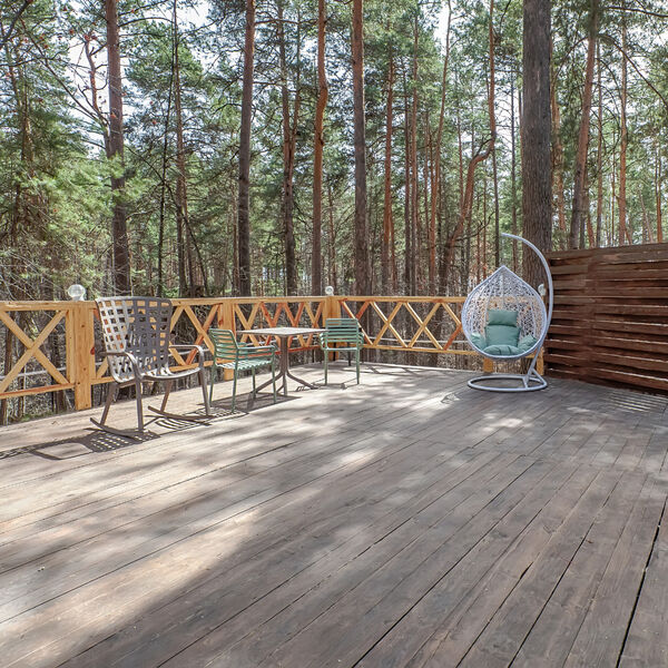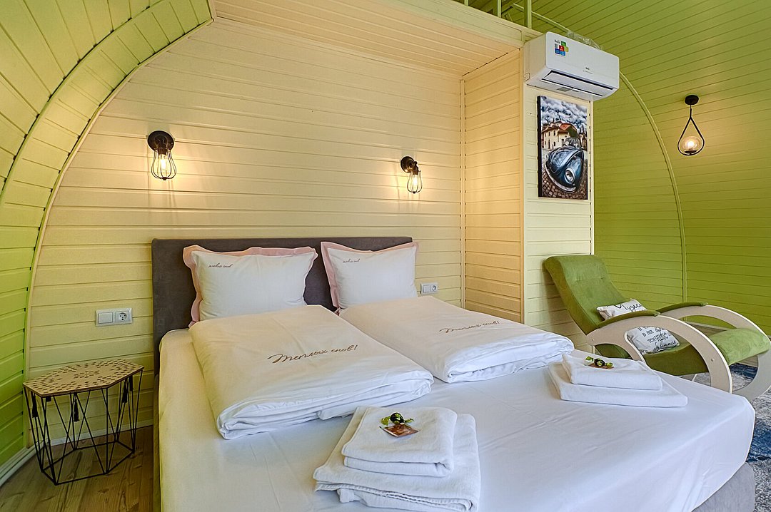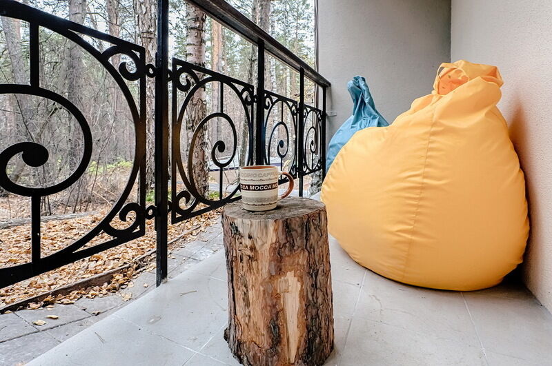 Однокомнатный номер с двуспальной кроватью, холодильник, санузел с душевой кабиной и всеми необходимыми принадлежностями (фен, зубной набор, гель для душа, шампунь, тапочки), чайник, набор посуды, просторный балкон с видом на лес.