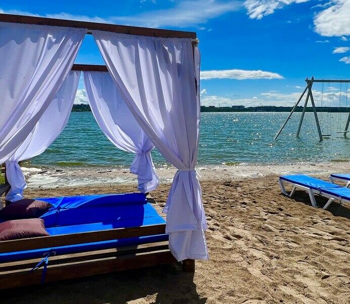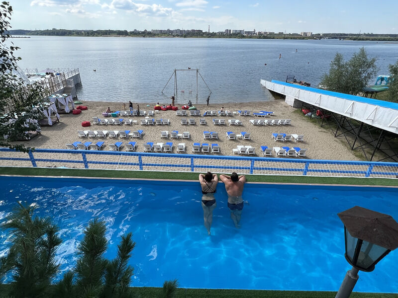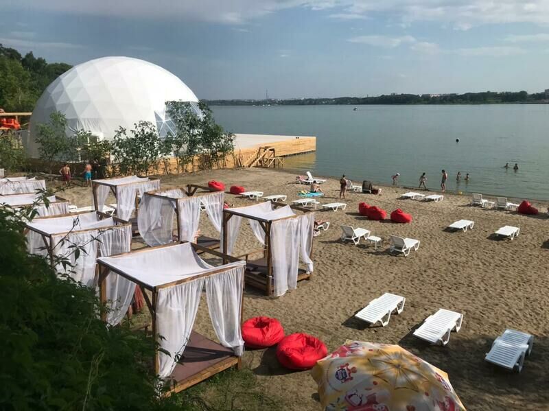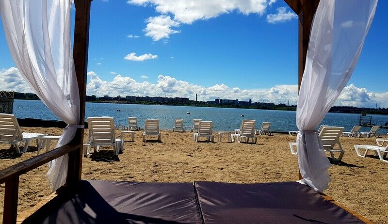 Пляж – песочный, расположен рядом на берегу Бердского залива. Это единственный пляж Сибири, имеющий первую категорию «Синий флаг». К услугам отдыхающих лежаки, кровати с навесами.