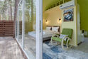 Однокомнатный номер с двуспальной кроватью, холодильник, кресло/диванчик, журнальный столик, санузел с душевой кабиной и всеми необходимыми принадлежностями (фен, зубной набор, гель для душа, шампунь, тапочки), чайник, набор посуды, просторный балкон с видом на лес.