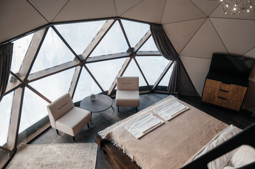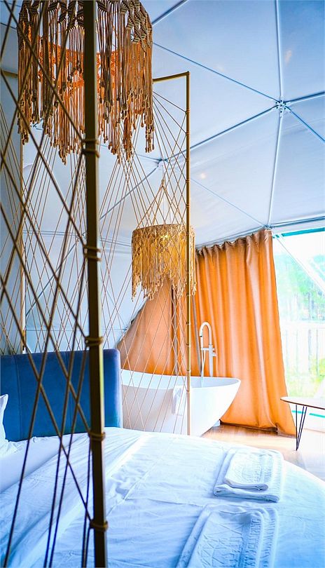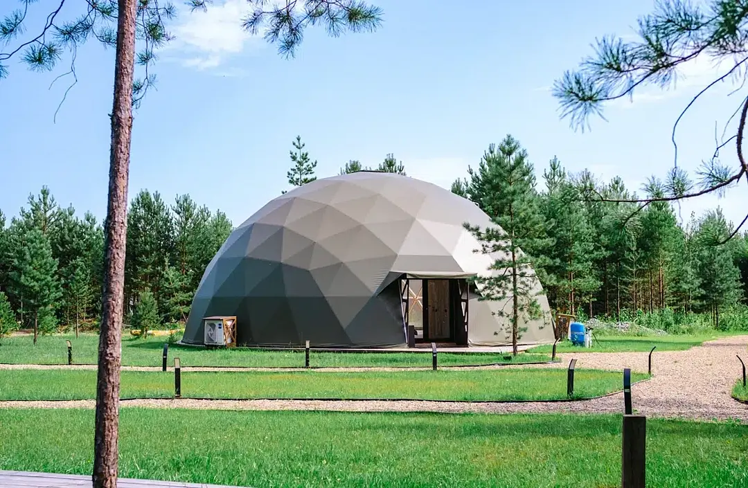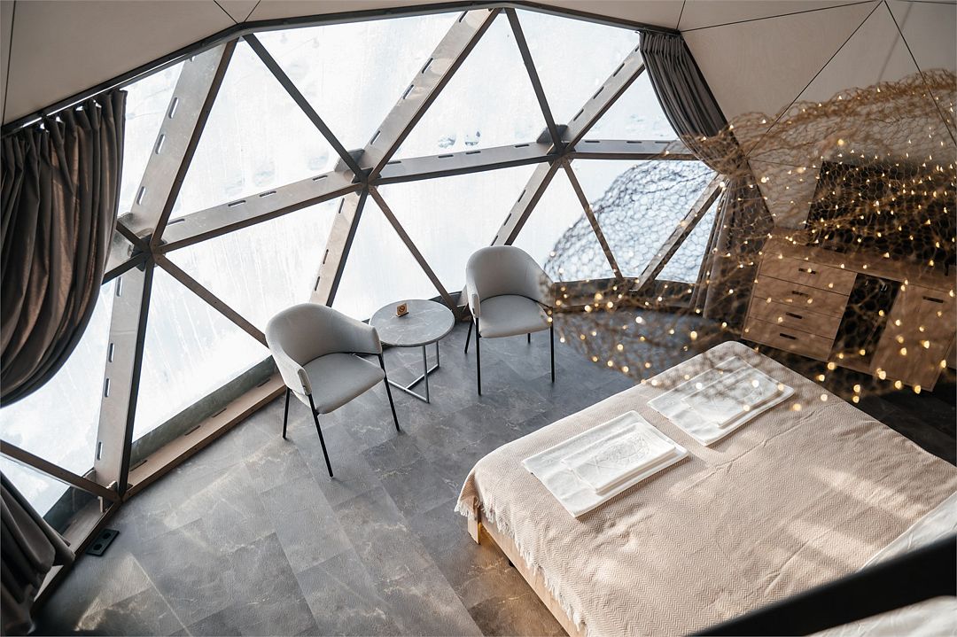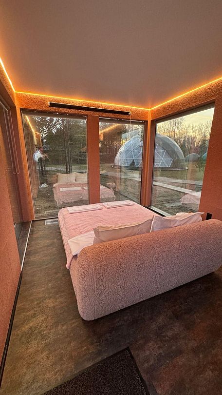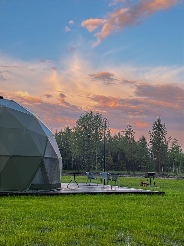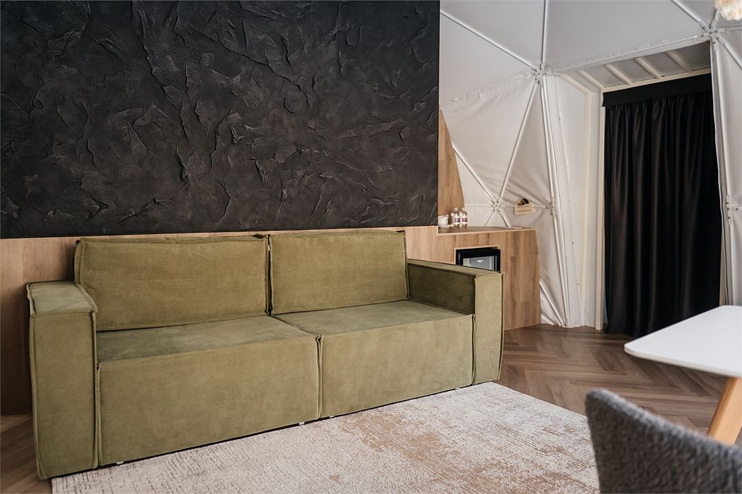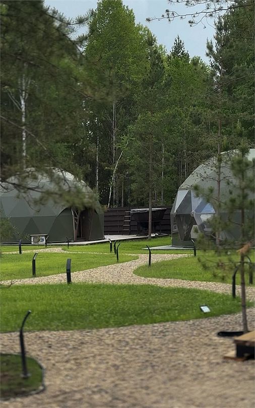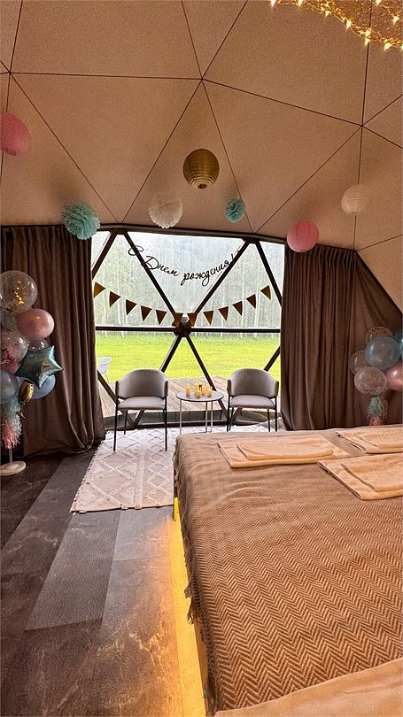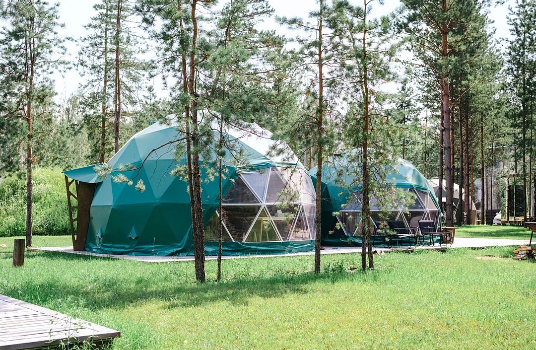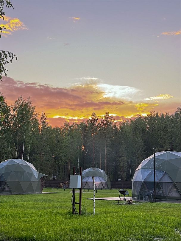 Купольные дома-сферы с панорамными окнами, расположенные среди живописного леса, обеспечивают полное единение с природой. Глэмпинги площадью от 33 до 53 м² оснащены всем необходимым для комфортного проживания: ортопедические матрасы, уютная мебель и хорошо оборудованные ванные комнаты. Каждая сфера имеет террасу с мебелью и зоной для мангала. Есть сферы с купелью и баней Фурако.
