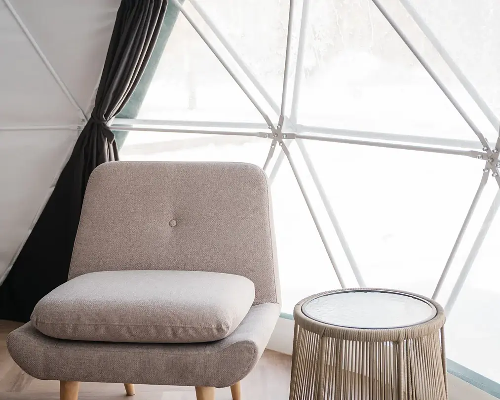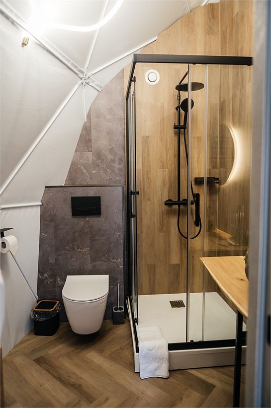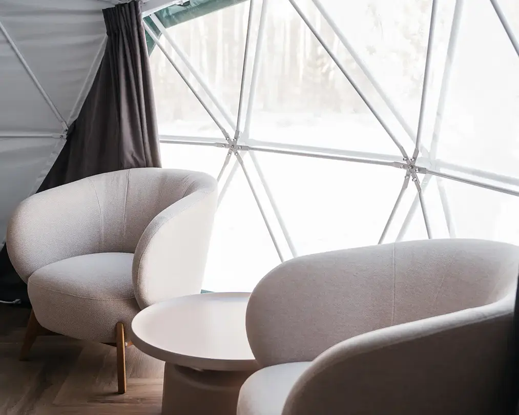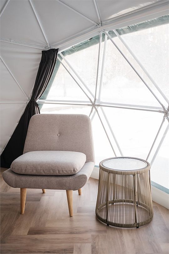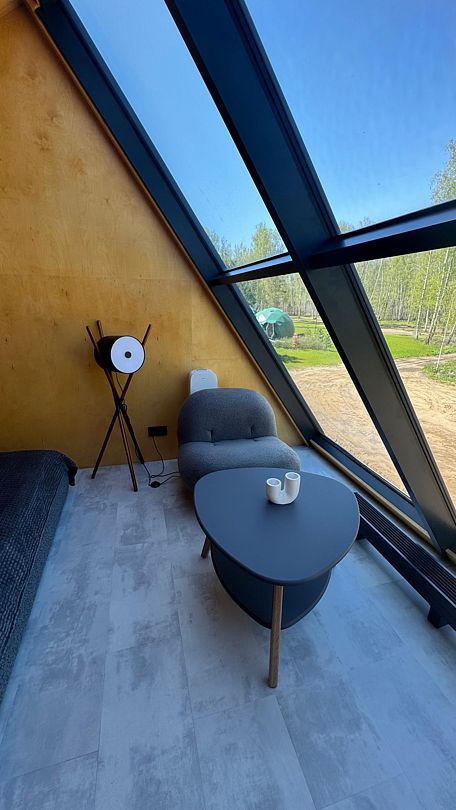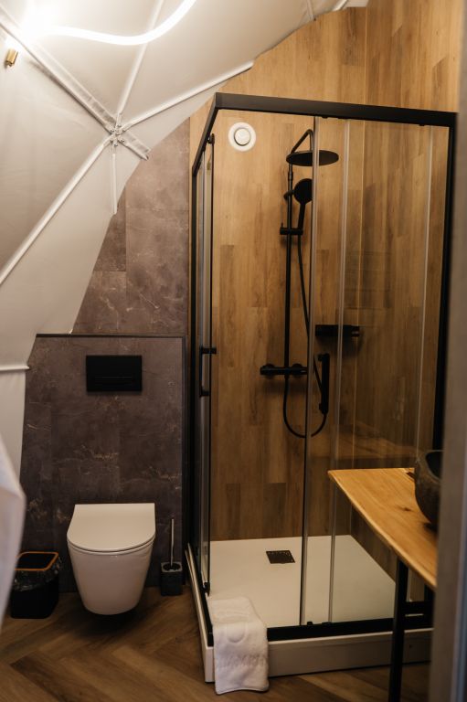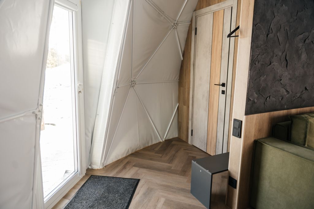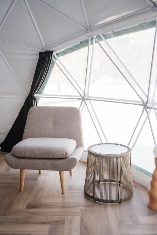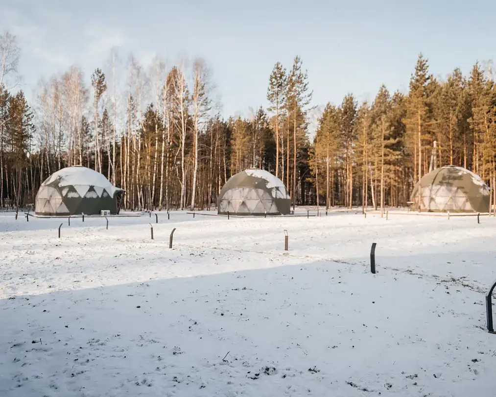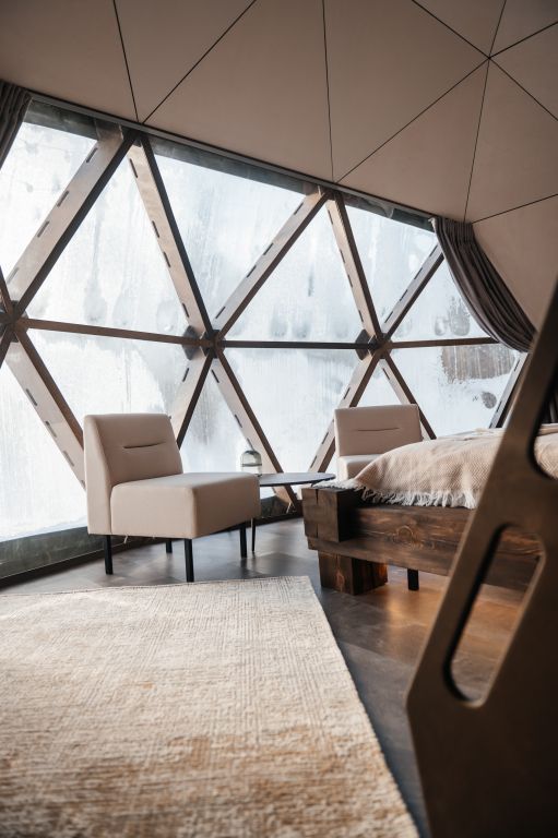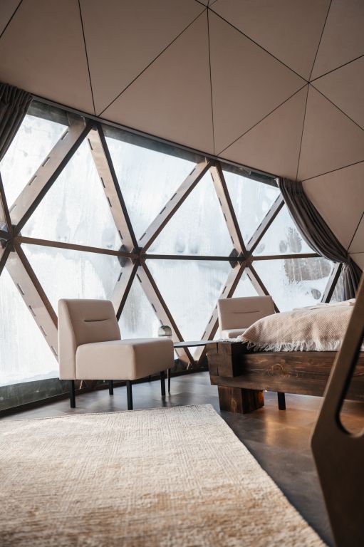 Купольные дома-сферы с панорамными окнами, расположенные среди живописного леса, обеспечивают полное единение с природой. Глэмпинги площадью от 33 до 53 м² оснащены всем необходимым для комфортного проживания: ортопедические матрасы, уютная мебель и хорошо оборудованные ванные комнаты. Каждая сфера имеет террасу с мебелью и зоной для мангала. Есть сферы с купелью и баней Фурако.