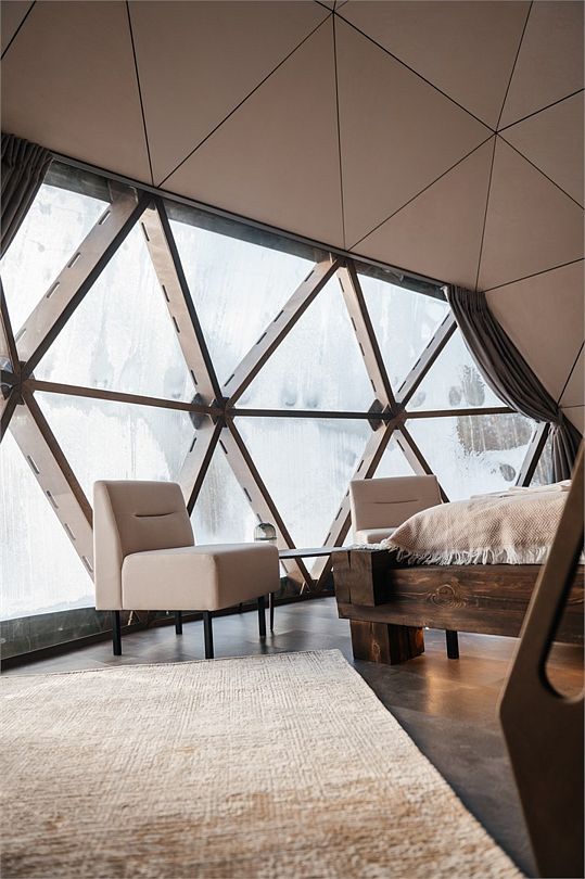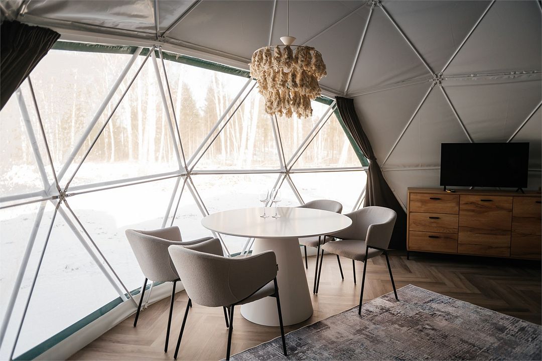 Роскошный дом-сфера площадью 38 м2 с дизайнерской отделкой, панорамными окнами и живописным видом на лес.