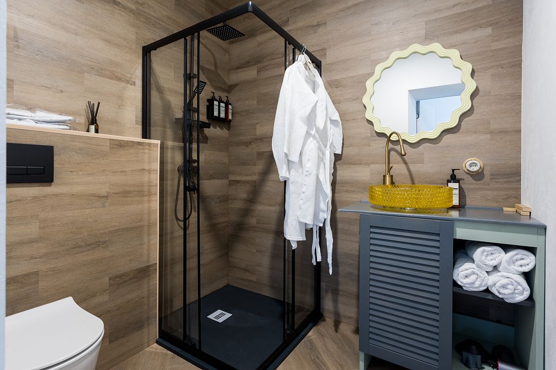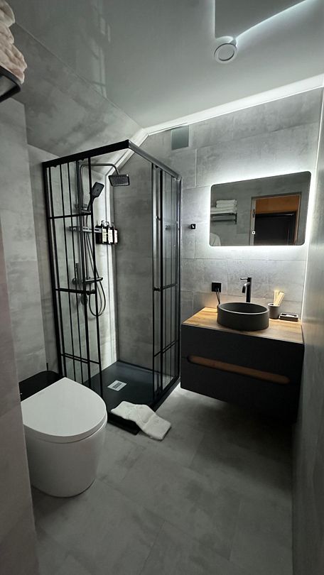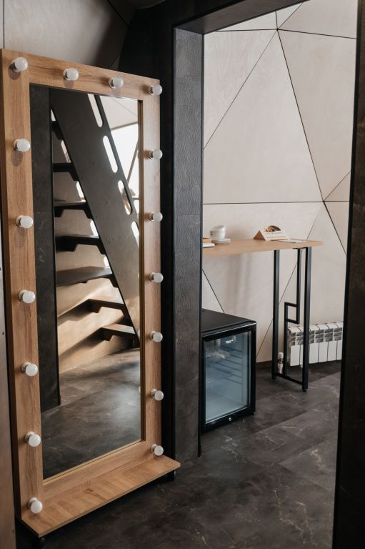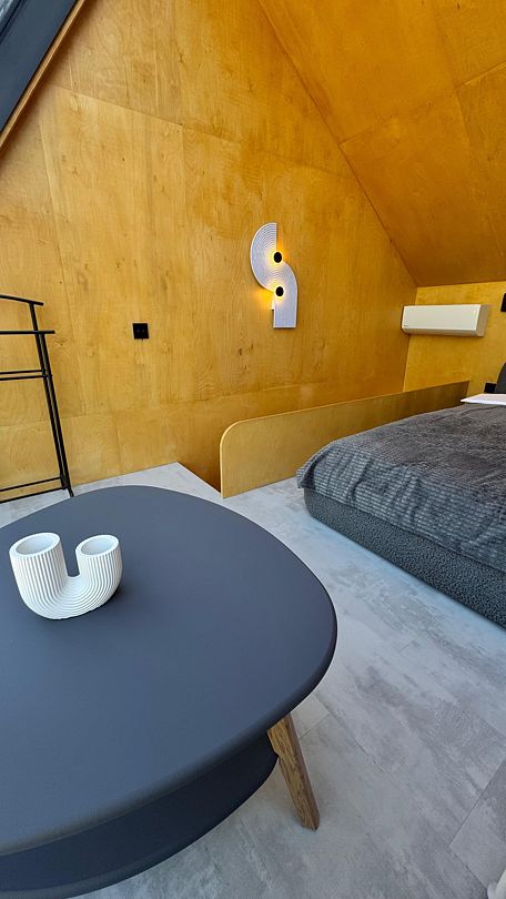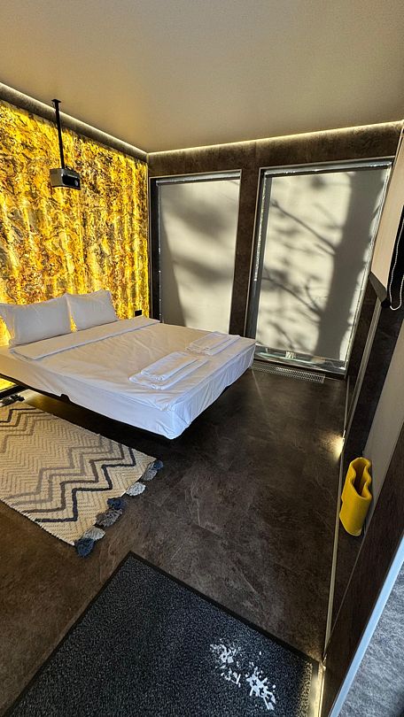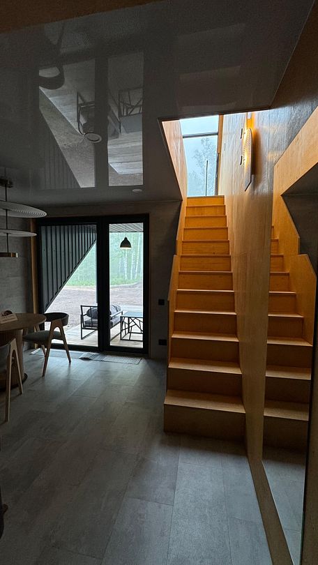 В номере имеются двуспальная кровать king size на первом этаже, 2 спальных места на мезонине, санузел с душевой кабиной. Кроме того, в доме есть терраса с мангальной зоной, где вы можете проводить время с семьей и друзьями или просто наслаждаться уединением. Рассчитан на проживание до четырех гостей.