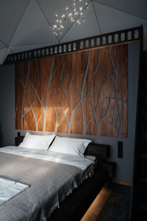 Зеркальный домик снаружи и в природном стиле Green внутри: с красивым видом и панорамными окнами. Двуспальная кровать queen size (160*200). Рассчитан на проживание двоих гостей.
