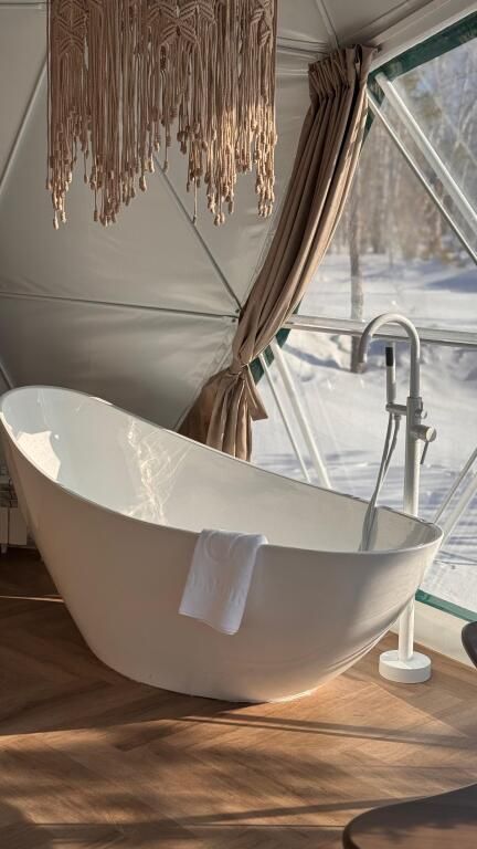 Комфортный дом-сфера площадью 38 м2 с современным дизайном, панорамными окнами. Эксклюзивность нашего дома-сферы заключается в наличии индивидуальной японской бани Фурако. Баня Фурако отличается своей уникальной конструкцией и использованием специальных трав и масел, которые помогают расслабиться и снять усталость.