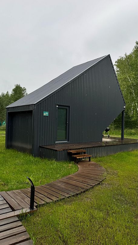 Внутри дома вас ждет уютная гостиная, оборудованная всем необходимым для комфортного пребывания: двуспальная кровать king size на первом этаже, 2 спальных места на мезонине, а также санузел с душевой кабиной и собственная терраса с мангальной зоной. Рассчитан на проживание до четырех гостей.
