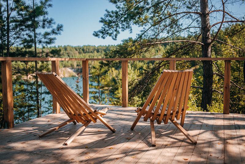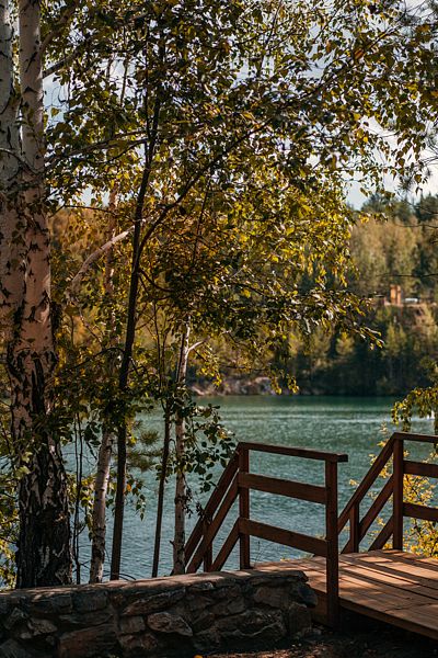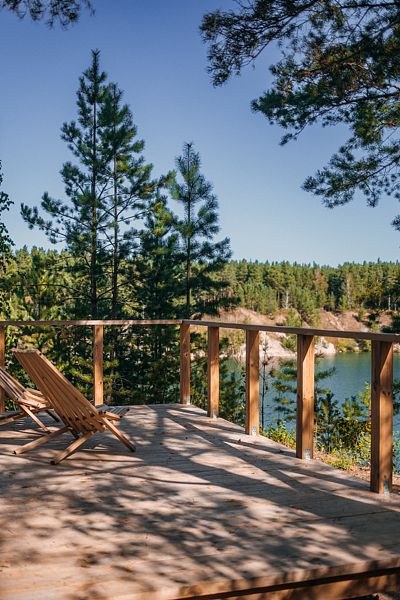 Закрытая территория с шезлонгами прямо у кромки воды. Уютный бар с прохладительными напитками, душ, туалет, мягкие лежаки и атмосферный вид на Мраморное озеро — всё, чтобы провести отдых с комфортом.