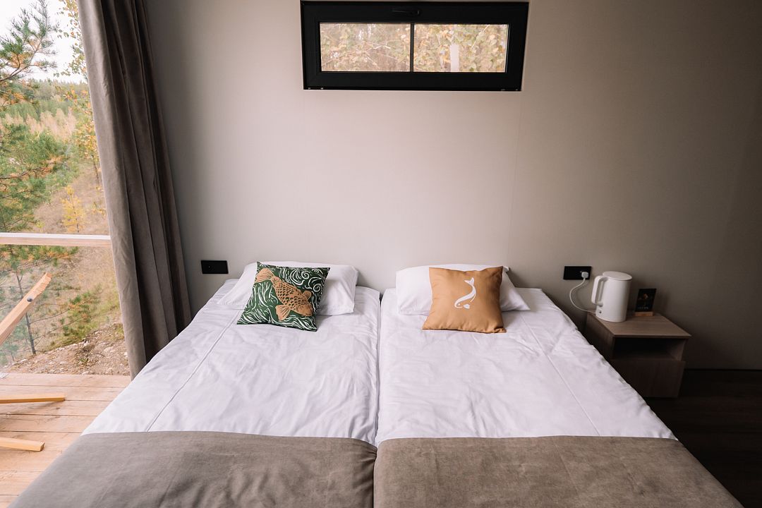 Отдельно стоящий благоустроенный вариант размещения с большим панорамным окном в пол, санузлом и видом на лес и озеро.