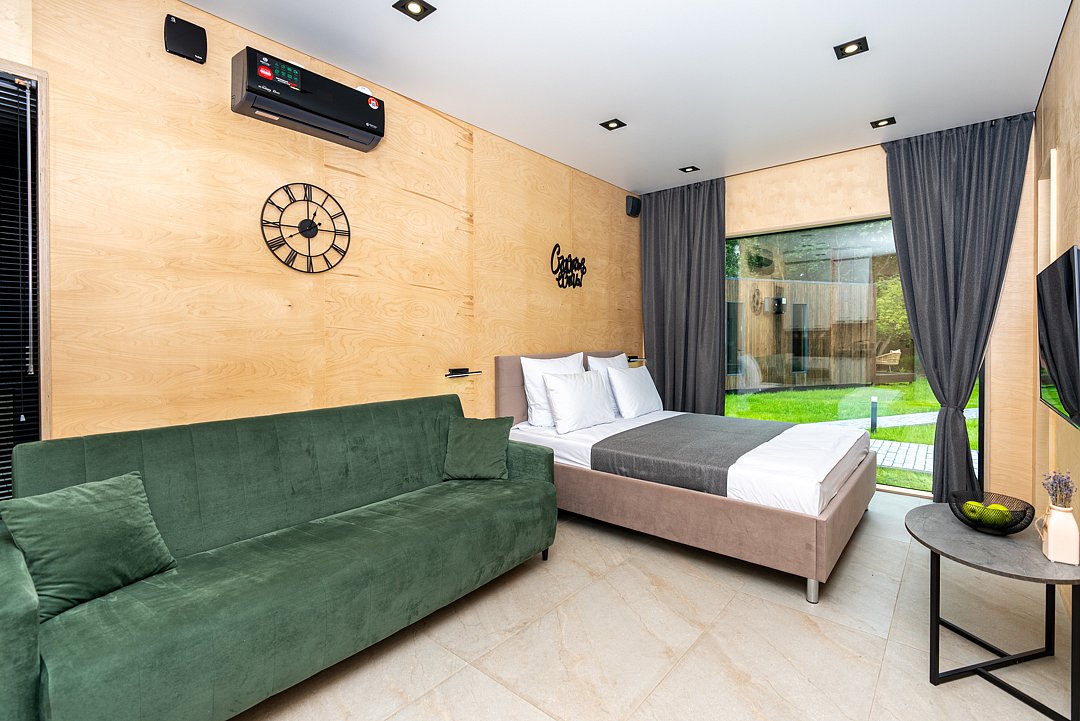Двуспальная кровать, диван, телевизор, холодильник, кондиционер, кухонная зона, с/у душ