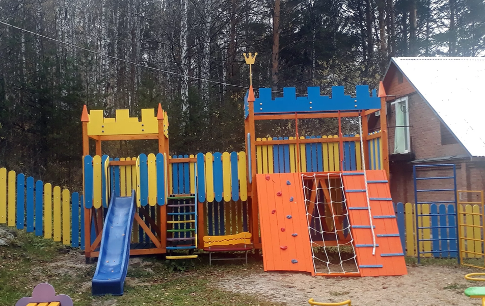 Для самых гостей предусмотрена большая игровая площадка с горкой, качелями, скалодромом, батутом и песочницей.