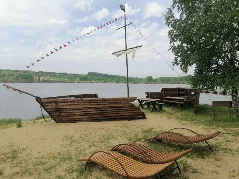Шезлонги (для проживающих). Мангальная зона в виде затонувшего пиратского корабля (для проживающих).