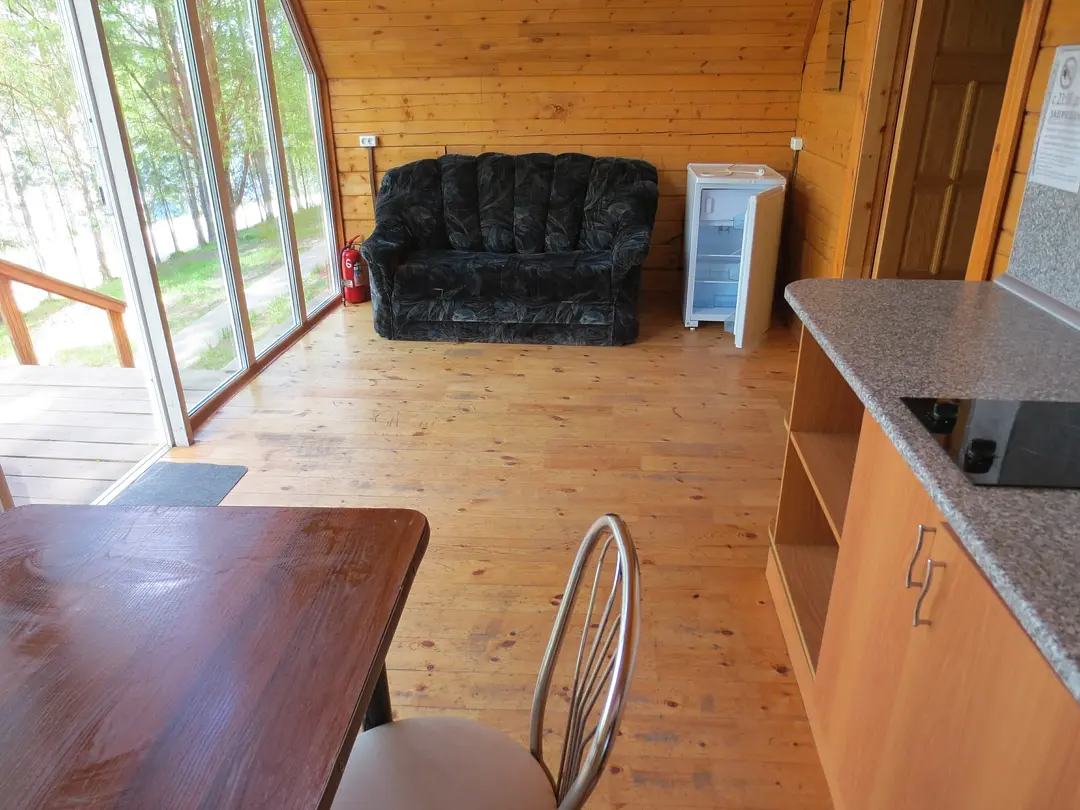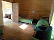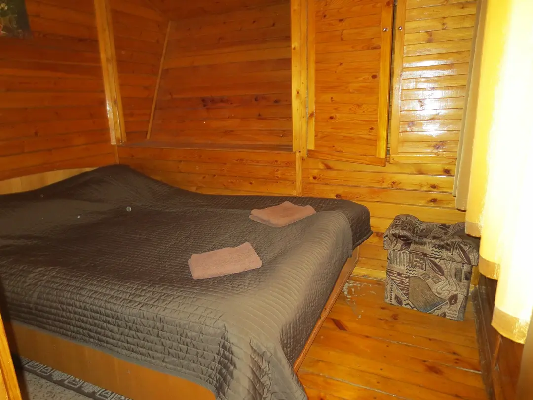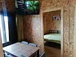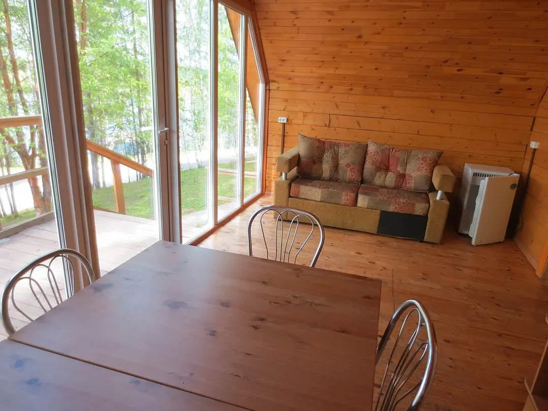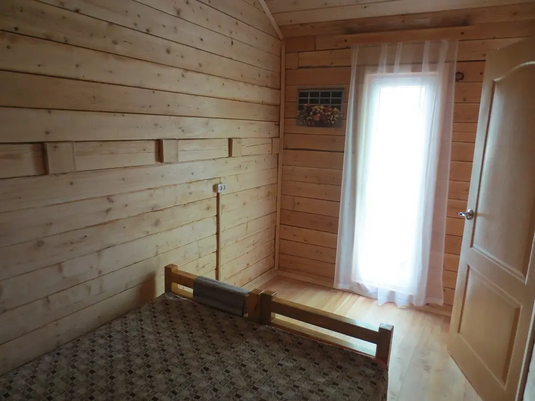 В номере спальный гарнитур, телевизор, холодильник, чайник, посуда, постельные принадлежности, полотенца. Туалет. Панорамные окна с видом на озеро.