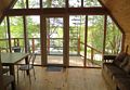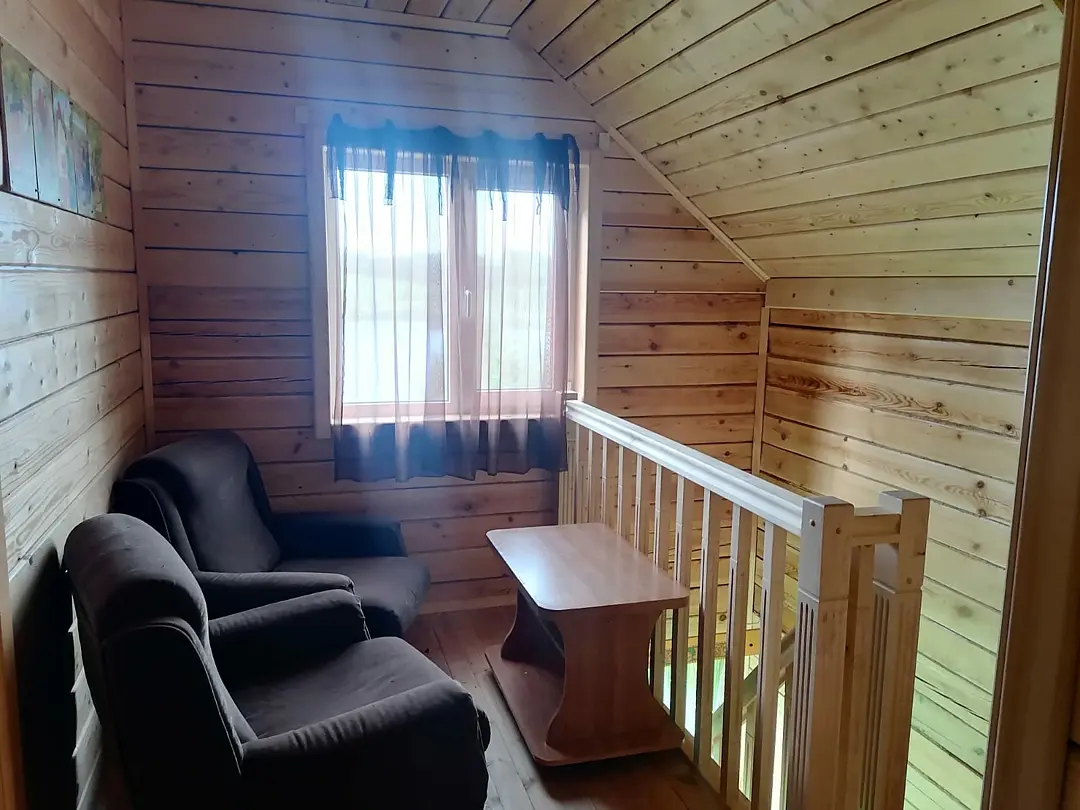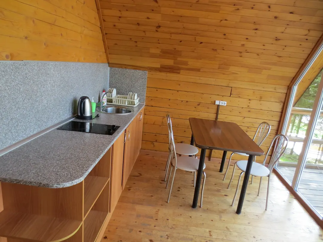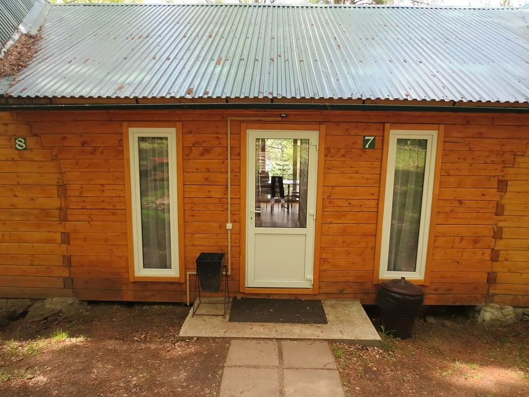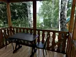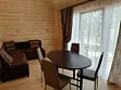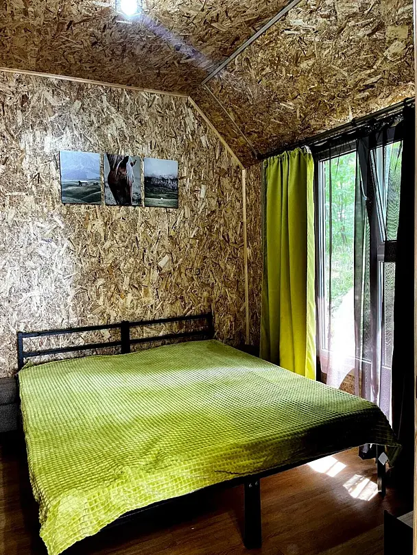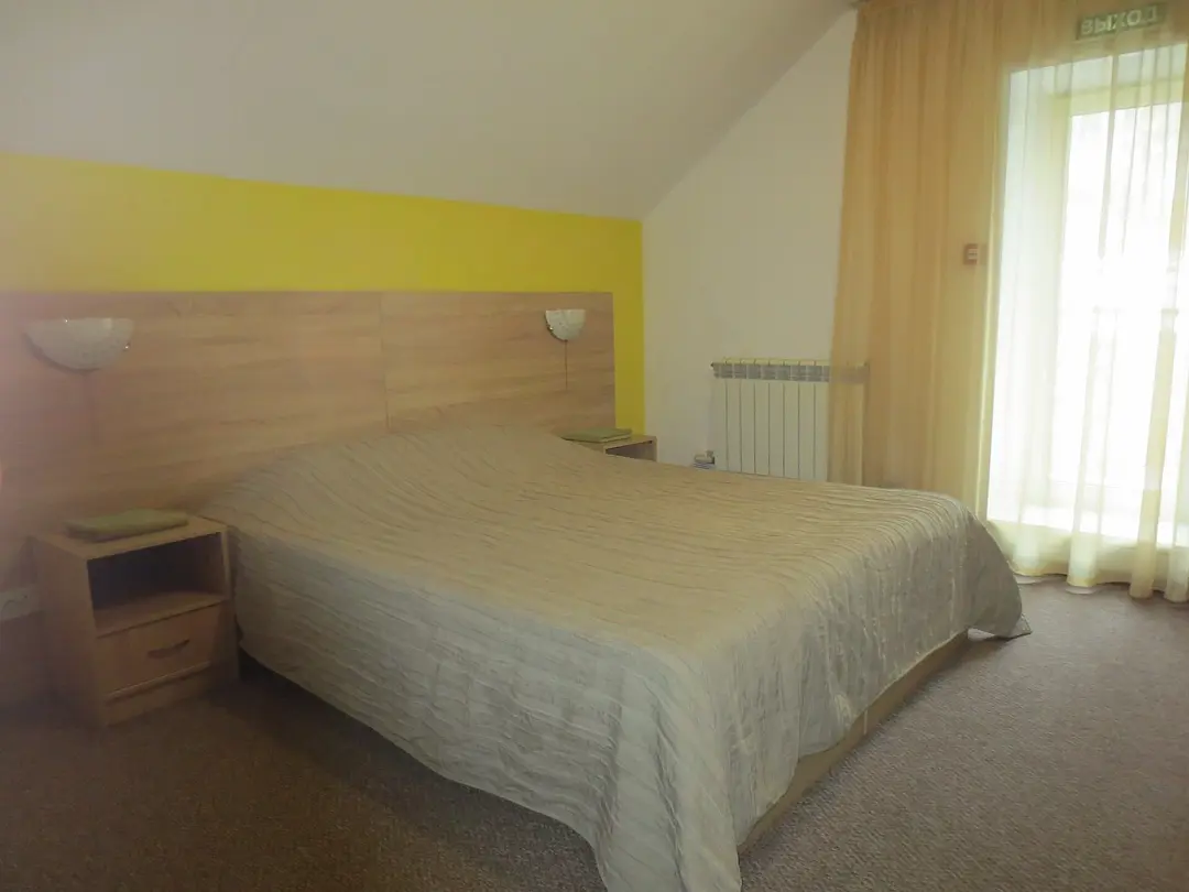 В номере спальный гарнитур, телевизор, холодильник, чайник, посуда, постельные принадлежности, полотенца. Туалет. Панорамные окна с видом на озеро.