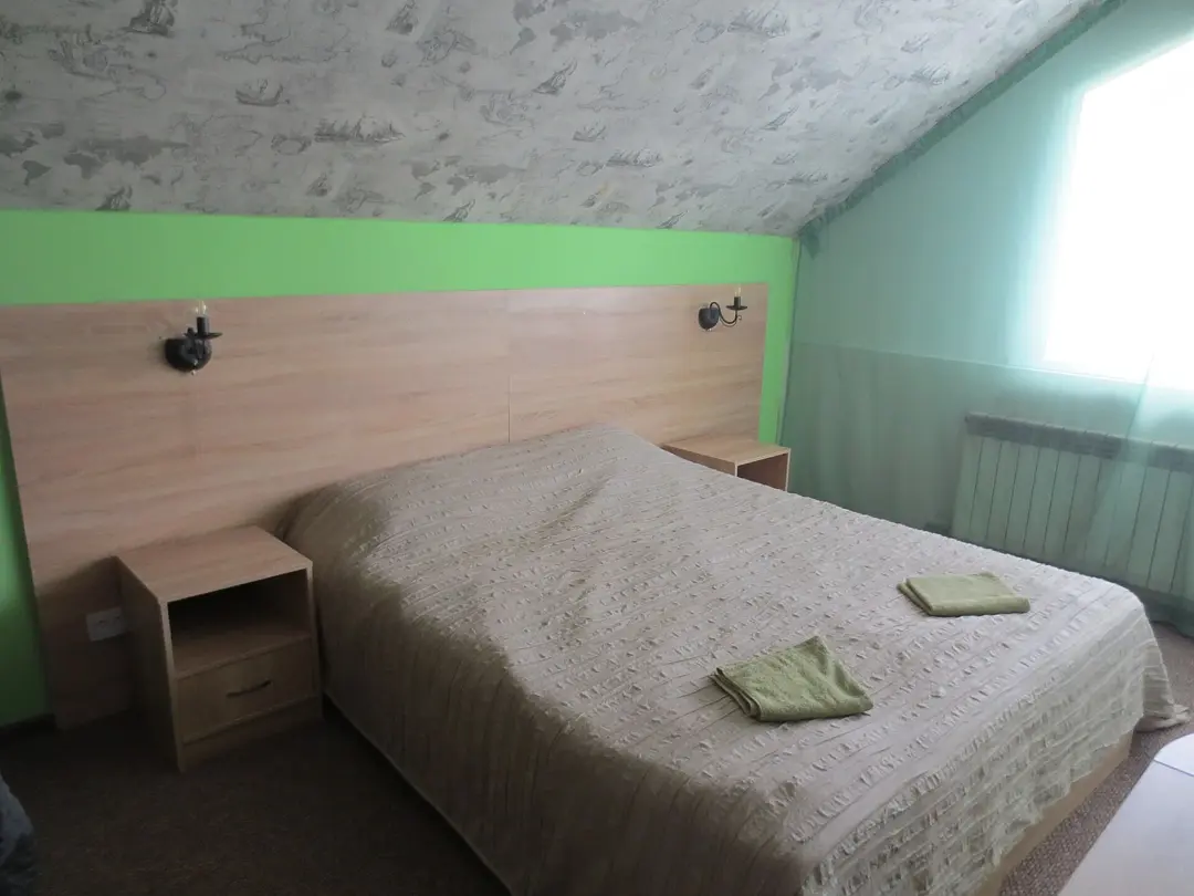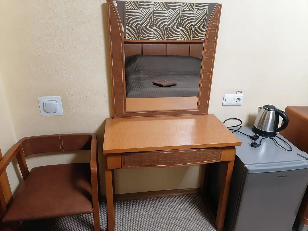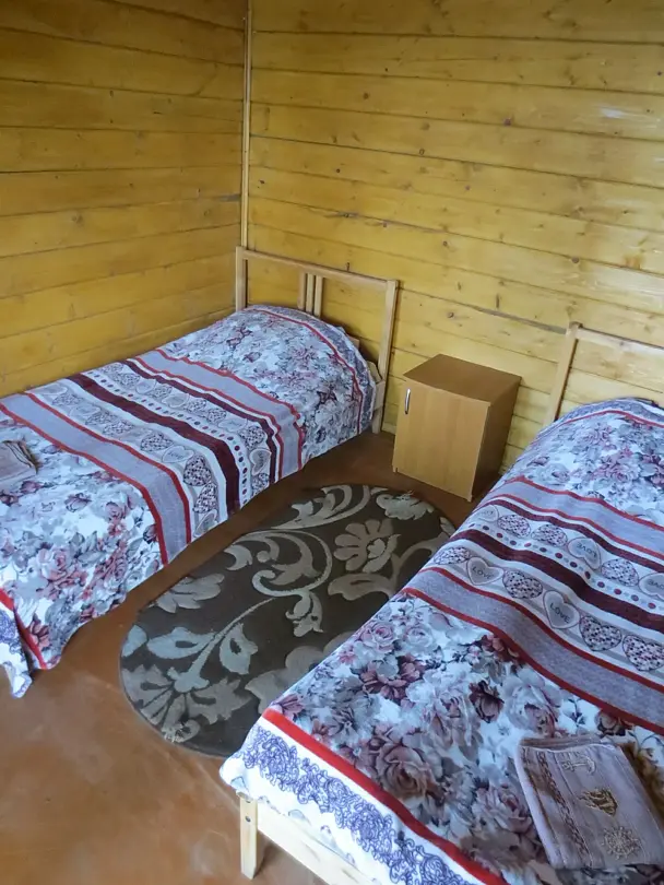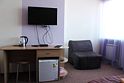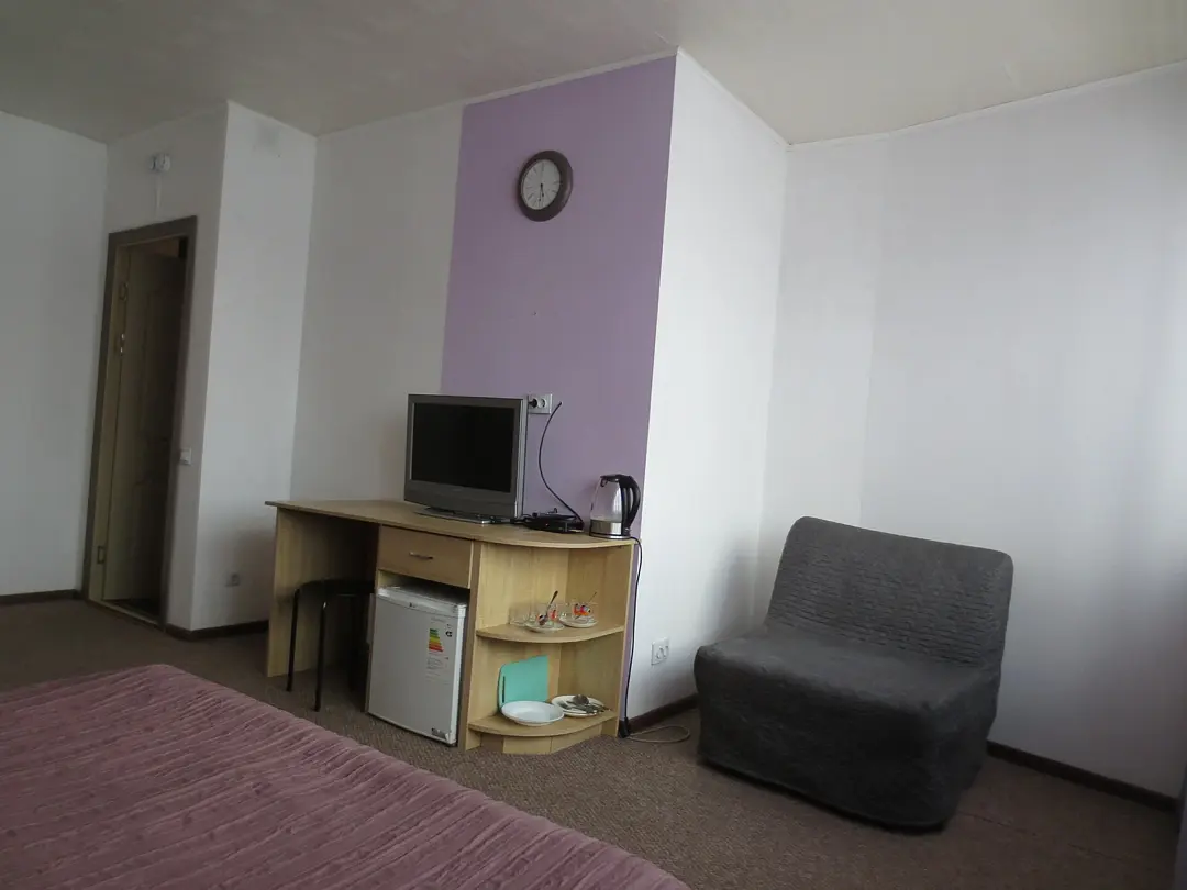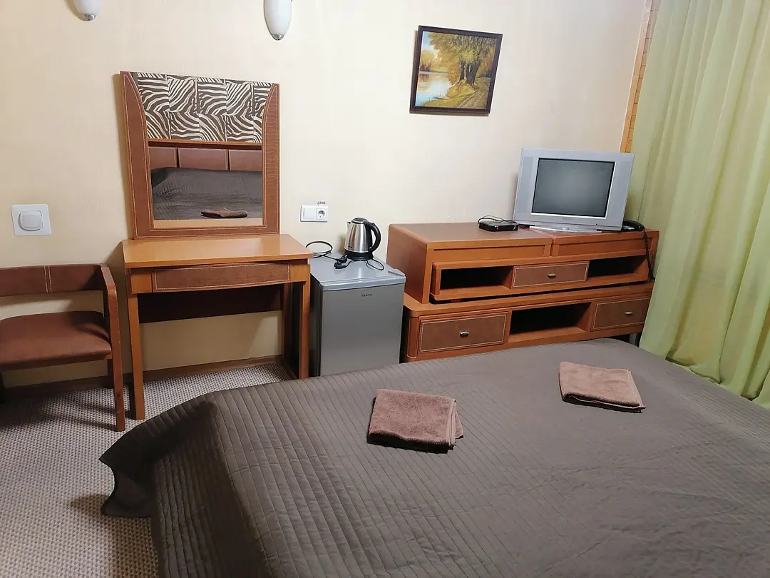 В номере спальный гарнитур, телевизор, холодильник, чайник, посуда, постельные принадлежности, полотенца. Туалет.