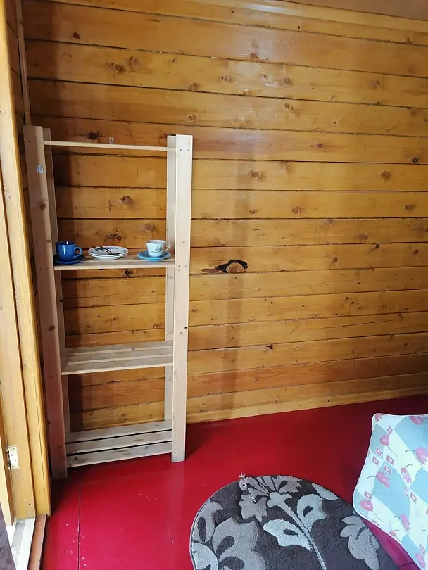 Постельное белье, полотенца, стеллаж посуда, чайник, стол, стулья.