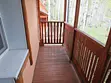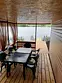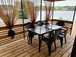 Терраса, постельное белье, полотенца, стеллаж, посуда, чайник, стол, стулья.