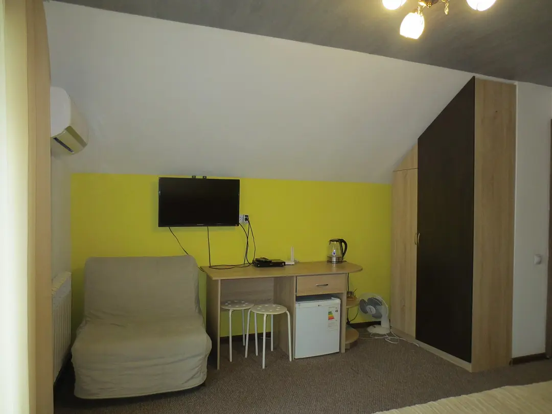Двуспальная кровать, доп.место – кресло-кровать, телевизор, холодильник, чайник, с/у и душевая