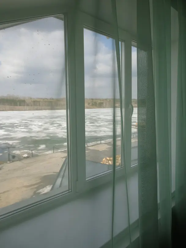 В номере спальный гарнитур, телевизор, холодильник, чайник, посуда, постельные принадлежности, полотенца. Туалет. Панорамное окно с видом на озеро.