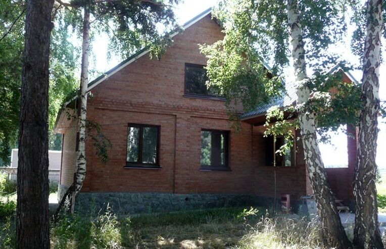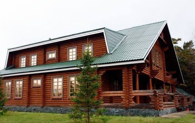 Двухэтажное здание из калиброванных бревен диаметром 22 см. Потолки и полы выполнены из сосновой рейки, деревянные стеклопакеты с 3-м остеклением, крыша из металлочерепицы, цоколь отделан алтайским природным камнем.