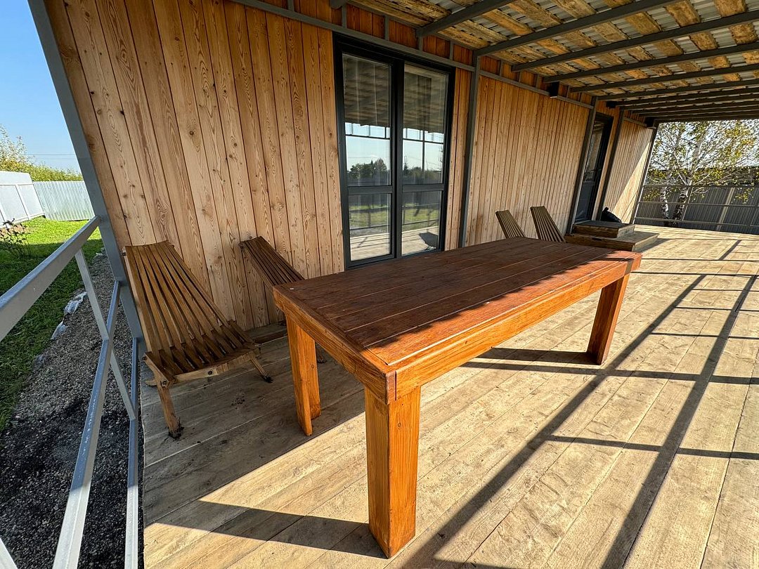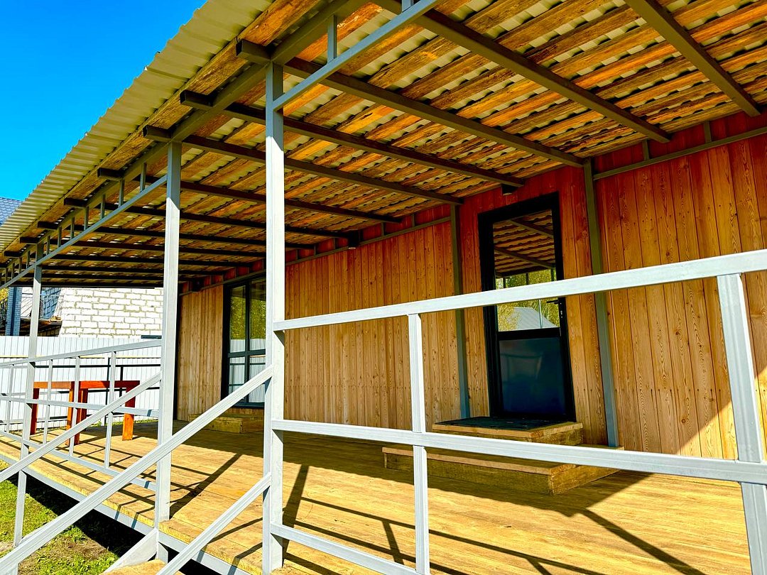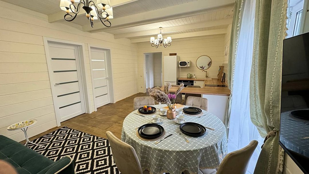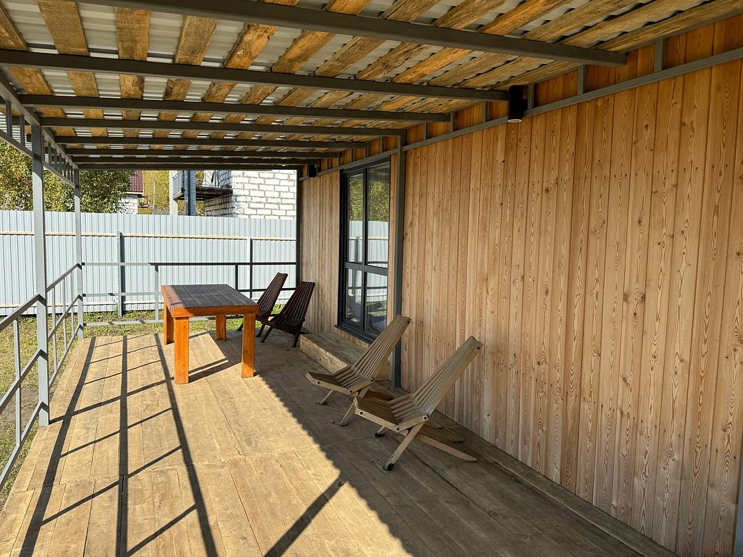 Одноэтажный домик с террасой располагается на небольшом благоустроенном участке в дачном товариществе «Озерное». Внутри: 4 комнаты с современным дизайном и тёплыми полами: три спальни и гостиная, объединенная с кухней, а также санузел с ванной. Кухня оборудована электроплитой, а также всей необходимой бытовой техникой и посудой. Перед домом имеется зона для барбекю с мангалом.
