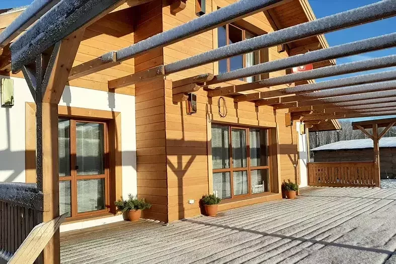 Двухэтажное шале с просторной гостиной и террасой.