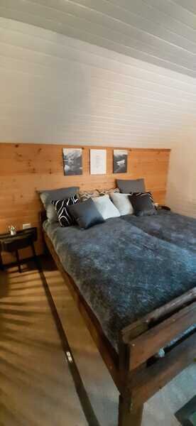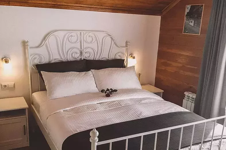 Большая спальня на втором этаже с кроватью King-size, удобный диван, который может быть комфортным спальным местом для двух гостей, витражные окна, открывающие обзор с высоты — все это только для вас.