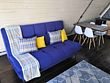 • большой раскладной диван в гостиной с телевизором и видом во двор;