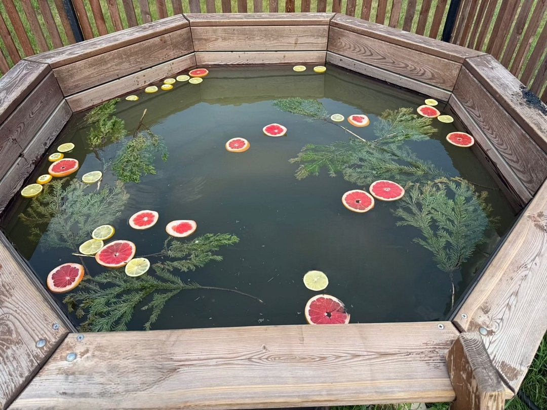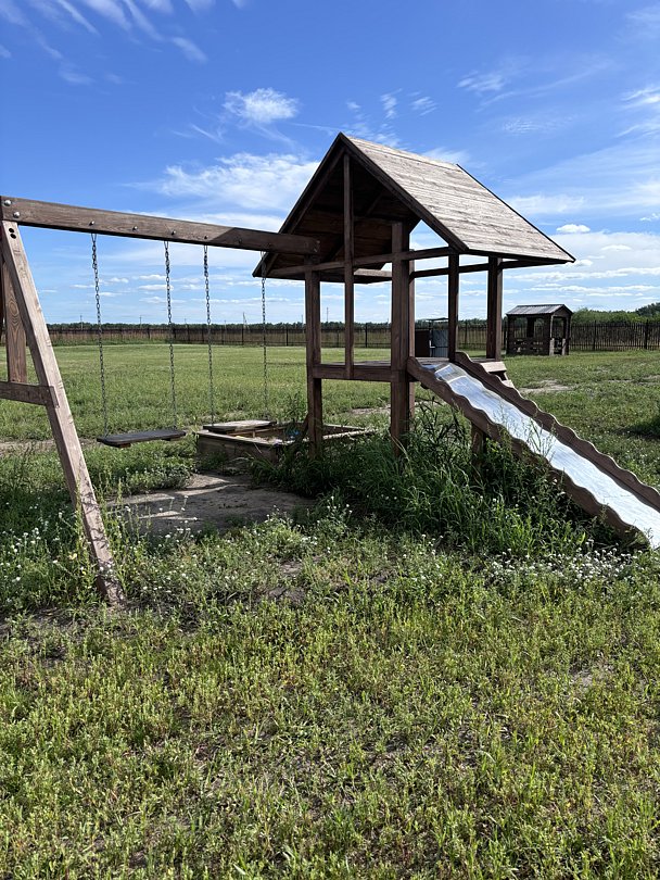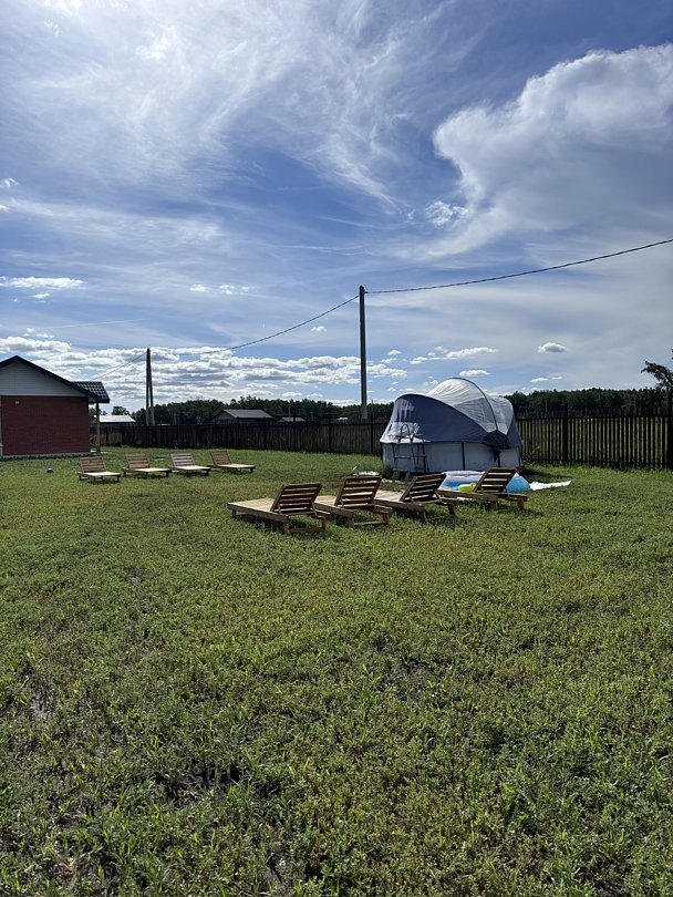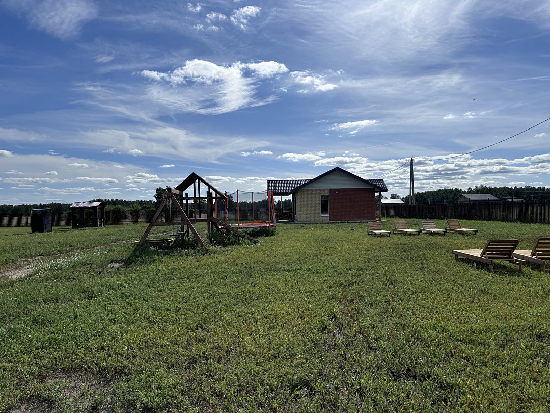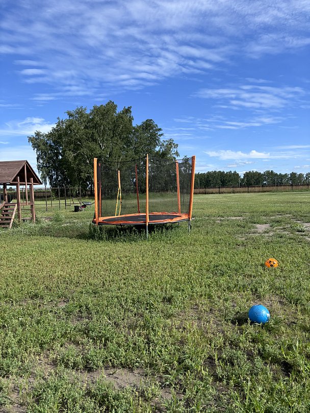 На территории батут большой до 150 кг. для детей и взрослых, бассейн в летнее время, лежаки. Детский игровой комплекс небольшой (горка, песочница, качели).
