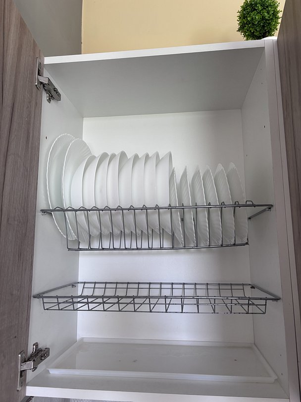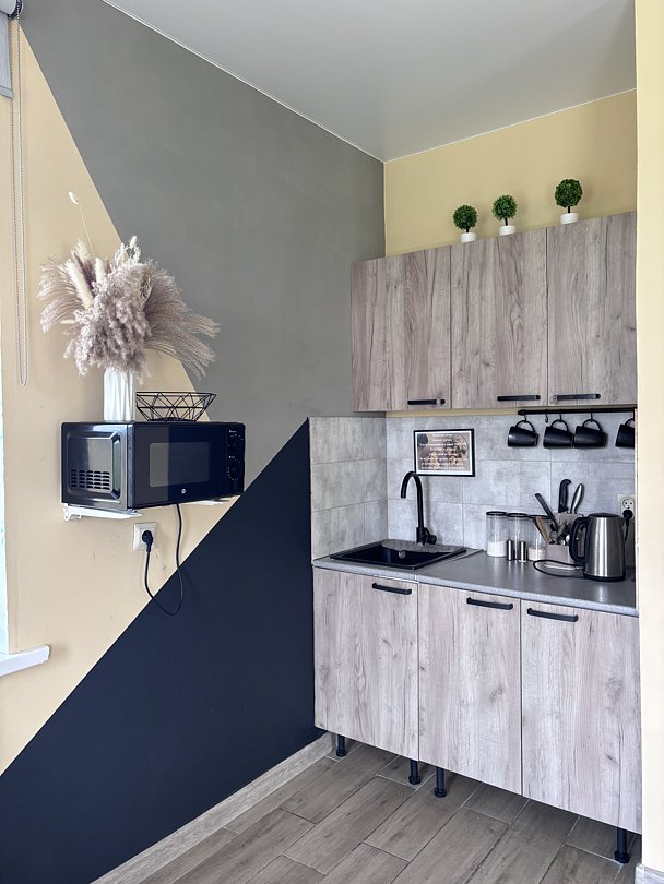 - кухонная зона с холодильником, электрической варочной панелью, микроволновой печью, чайником и всем необходимым для приготовления пищи;
