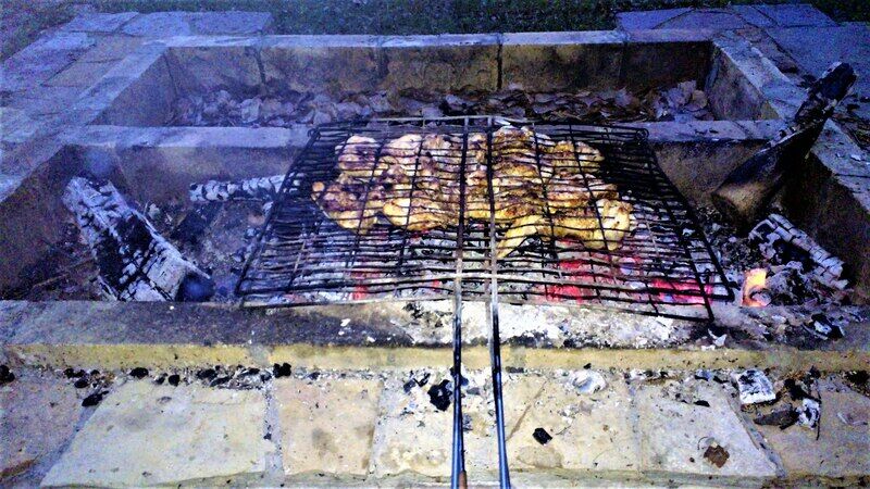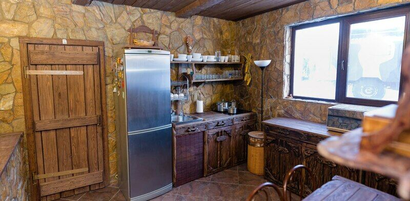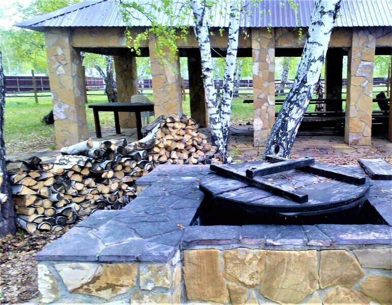 - 1-ая зона: - уличная каменная беседка с мангалом и встроенном казаном (около 30 литров), что позволяет готовить различные блюда на костре как для больших, так и для маленьких компаний.