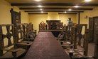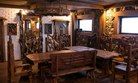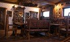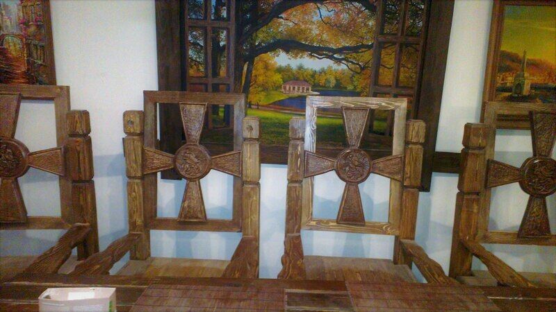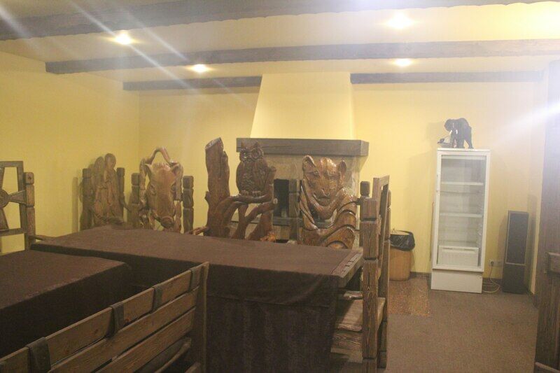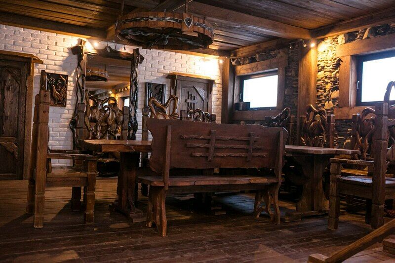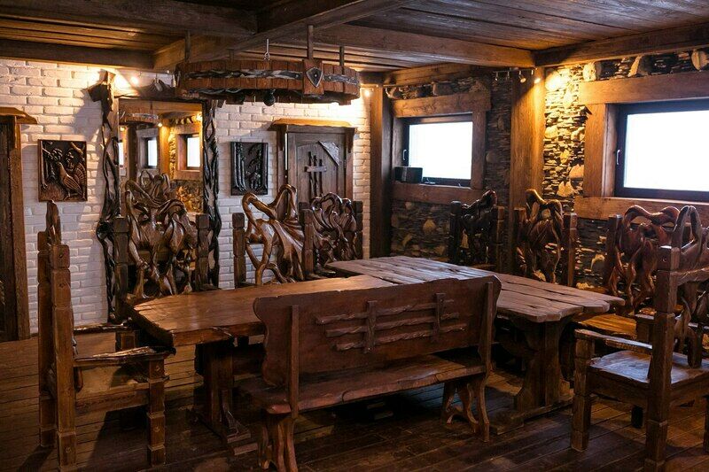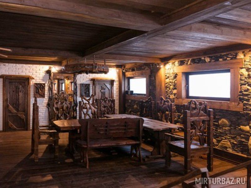 - зал с камином, СТОЛЫ С РЕЗНЫМИ СТУЛЬЯМИ ИЗ КЕДРА площадью около 65 кв.м.;