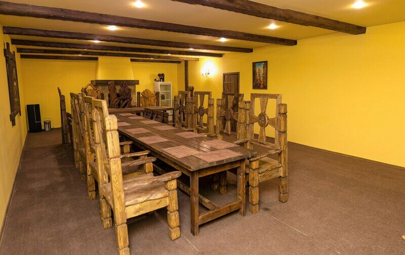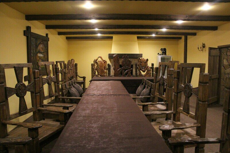 - банкетный зал с камином (стол для банкета, эксклюзивные стулья, телевизор и т.п.), площадь около 70 кв.м,