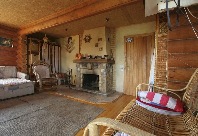Камин, косметические принадлежности, простая и уютная обстановка.