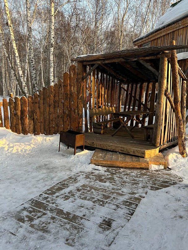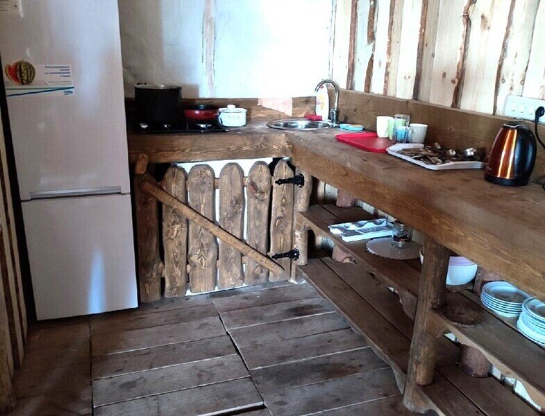 В домике: печное отопление, теплый пол. Душ, туалет, постельное бельё, полотенца, посуда, холодильник, мини-печь.