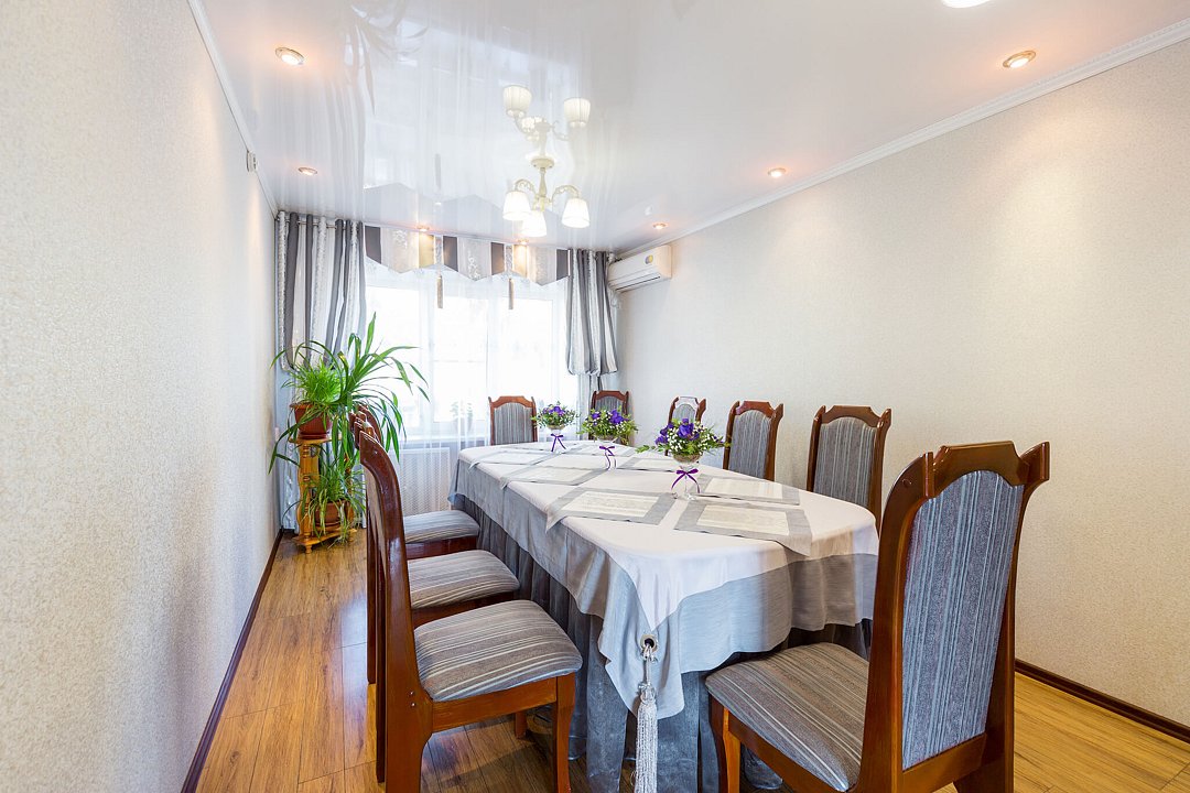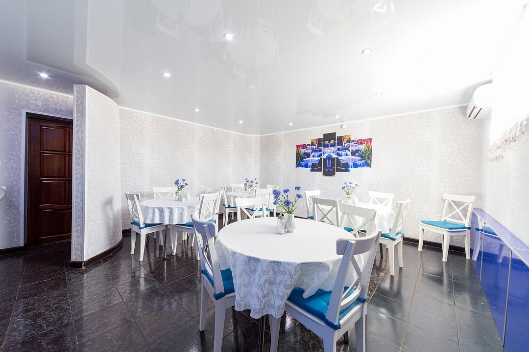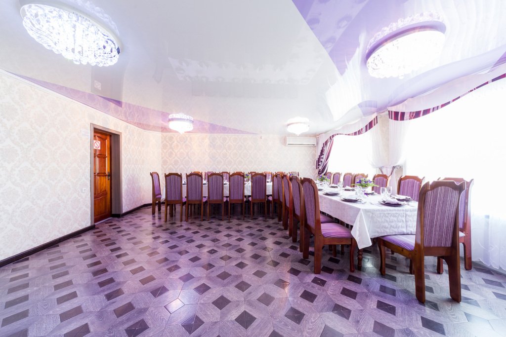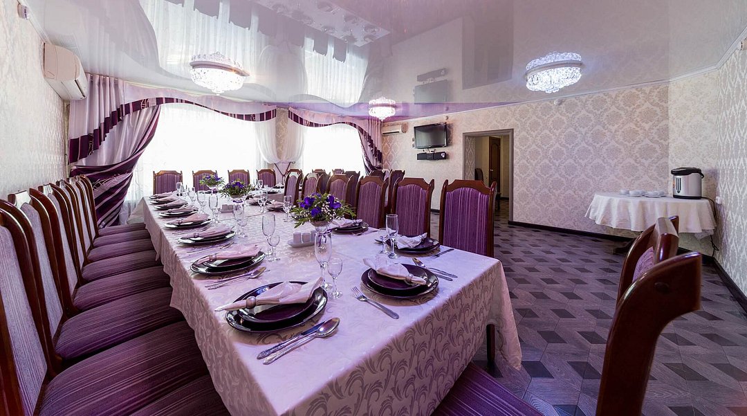 Банкетный зал, рассчитанный на 45 мест, сдается для проведения корпоративных, свадебных, юбилейных торжеств, семинаров, презентаций, деловых встреч. Светлый и просторный зал расположен на 2-ом этаже гостиницы, обслуживается гостиничным кафе.