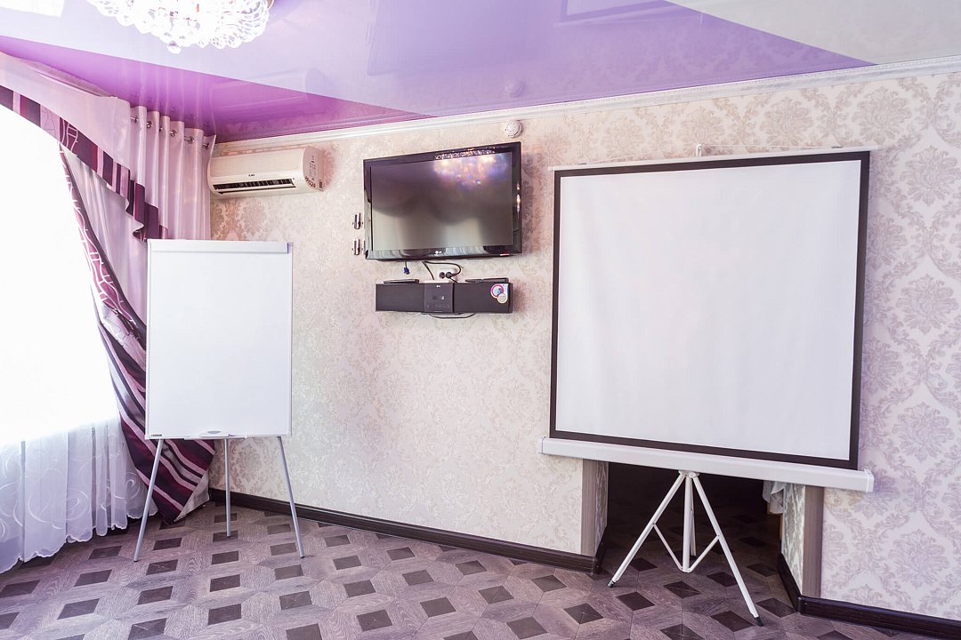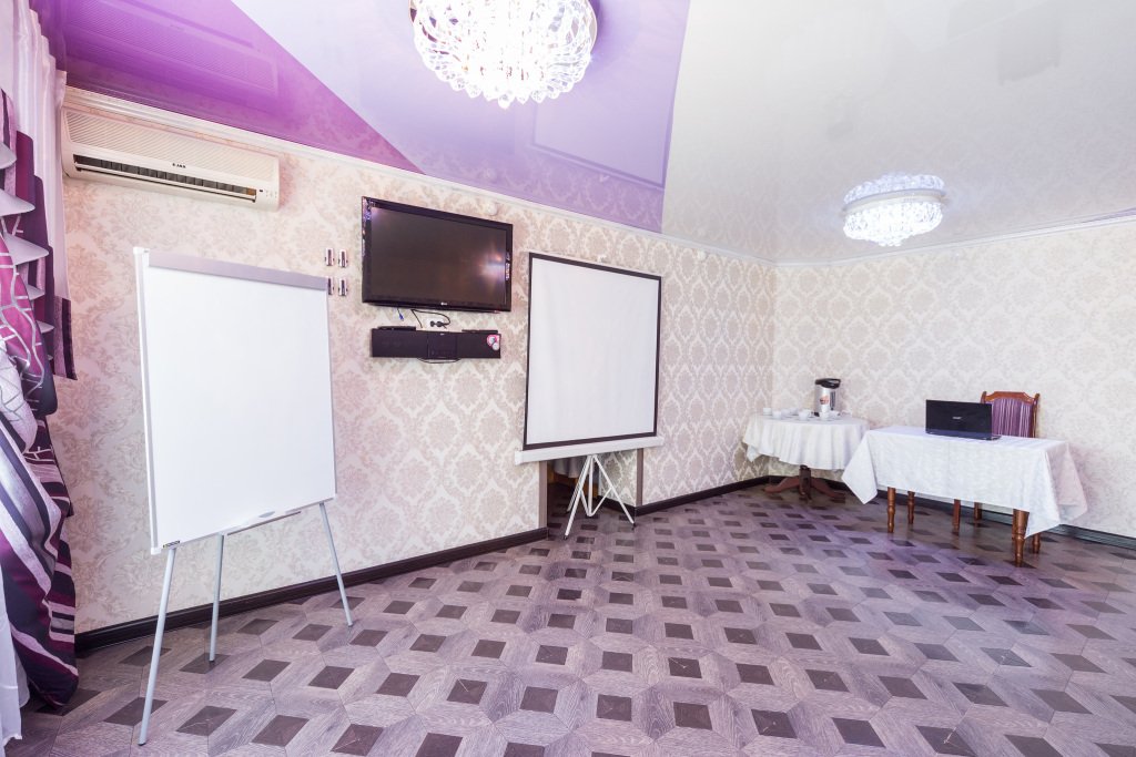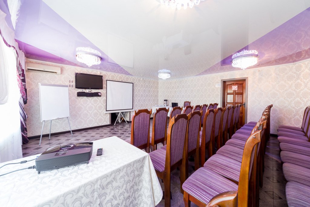 Конференц-зал рассчитан до 14 человек — малый зал и до 40 человек — большой зал. Идеальное место с деловым интерьером и обстановкой для проведения бизнес встреч, ведения переговоров, организации презентации. Для проведения презентации, демонстрации вашего материала предоставляем телевизор с большим экраном, видеопроектор, напольный экран 127х127, магнитная доска. По желанию предоставляем бизнес-ланч, кофе-брейк, фуршет или полноценный горячий обед (ужин). Оформляем полный пакет документов.