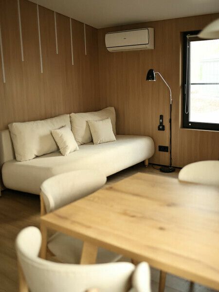 Ваше проживание организовано с особым вниманием к комфорту. Просторный дом включает уютную спальню с удобной двуспальной кроватью для полноценного отдыха, гостиную зону с раскладным диваном и полностью оборудованную кухню. Отдельная ванная комната с душем дополняет все необходимые удобства для комфортного пребывания. В специальных сервис-боксах вы найдёте всё необходимое для приятного времяпрепровождения.