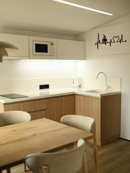 - полноценная кухня: плита, холодильник, микроволновка, чайник;