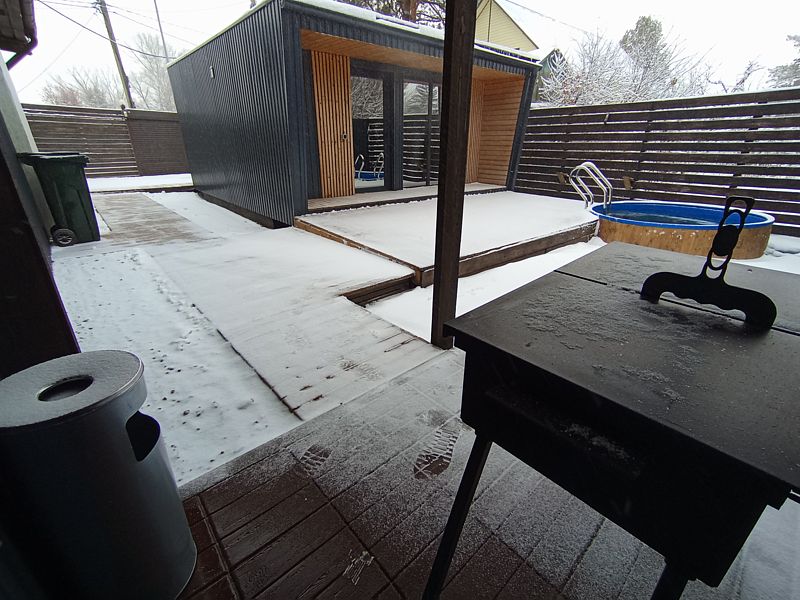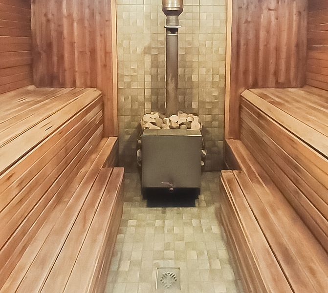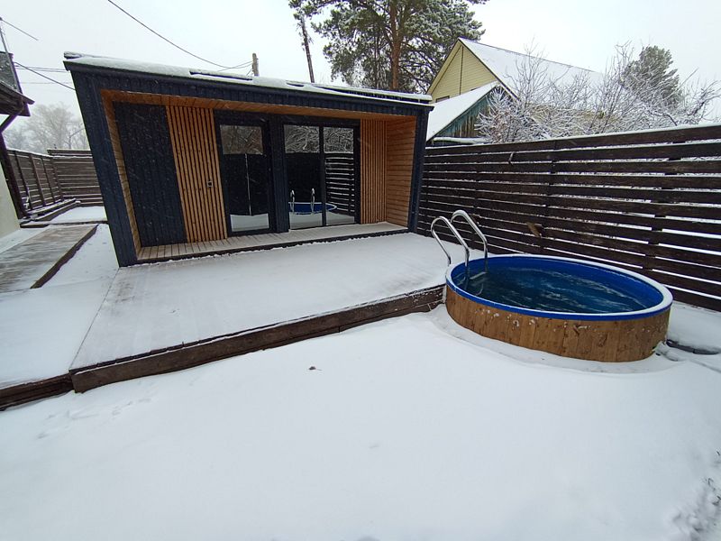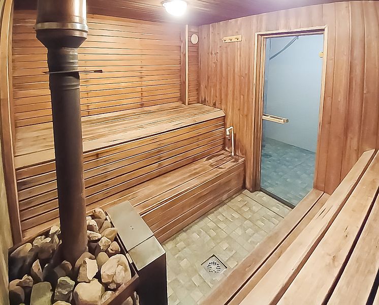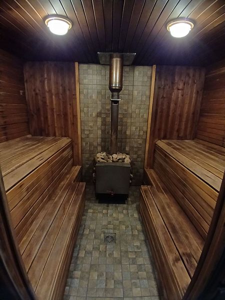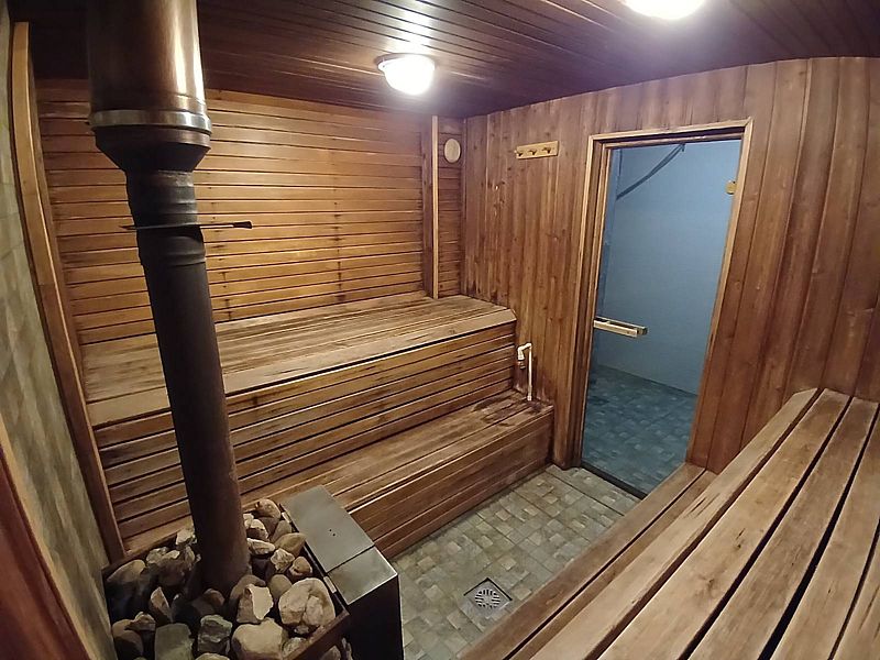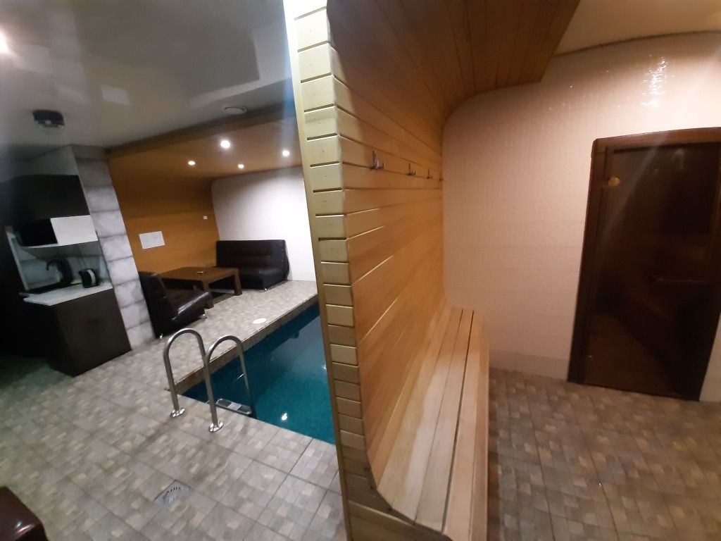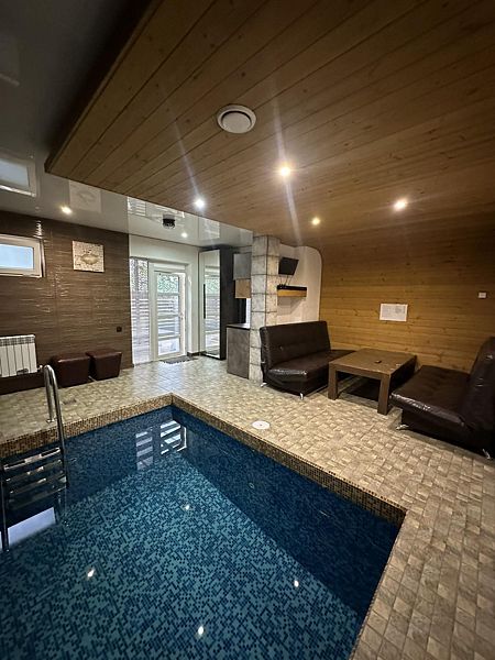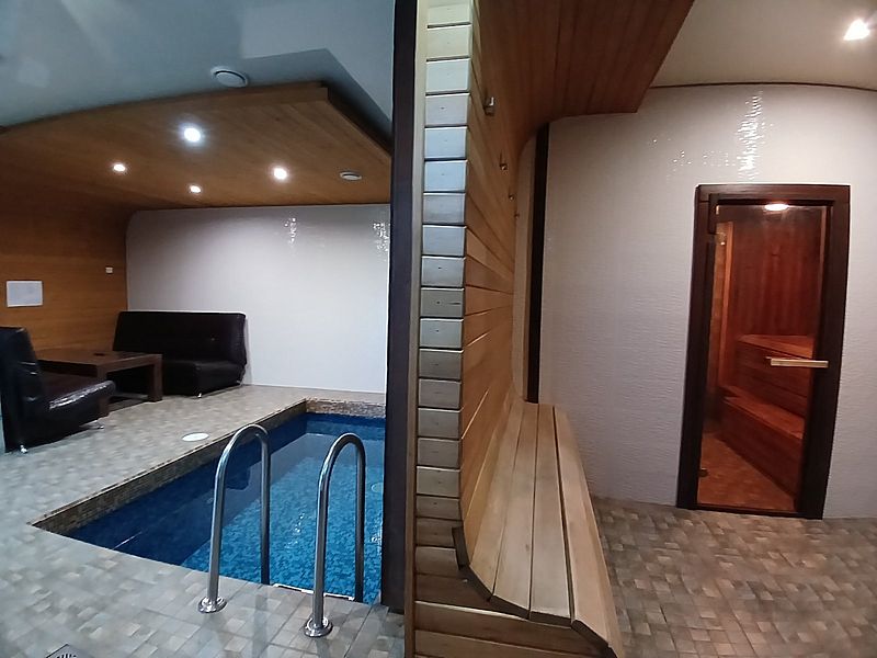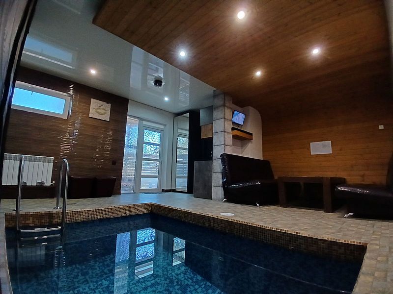 В гостевом доме есть крытый бассейн, в который дети до 14 лет могут входить только в сопровождении взрослых. Перед купанием рекомендуется принять душ. Рядом с бассейном находится баня на дровах.