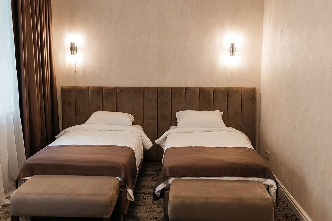 Однокомнатный номер с двумя раздельными кроватями. Прикроватный столик, два стула. телевизор, мини - бар.