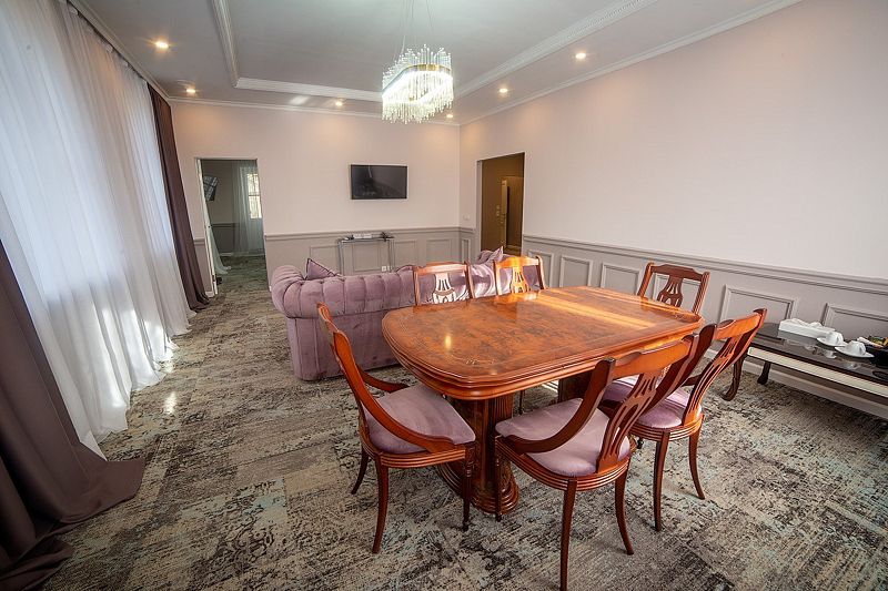 Двухкомнатный номер с широкой кроватью и раскладным диваном. В гостинной большая обеденная зона, стол и 6 стульев. Можно использовать как комнату для переговоров. Возможность размещения на дополнительных местах до 4х человек.