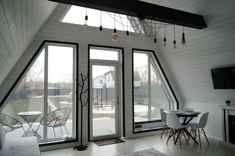 Планировкой предусмотрена просторная кухня-гостиная со вторым светом и электрокамином. На первом этаже есть отдельная спальня, на втором уровне дополнительное спальное место с большой кроватью.
