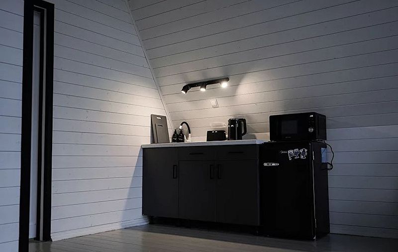 Кухня-гостиная оборудована плитой, микроволновой печью, чайником и всей необходимой посудой. А на свежем воздухе есть мангал.