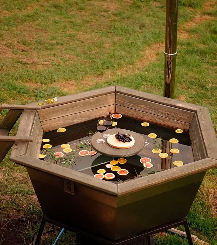 Обратите внимание, что на территории расположены 4 домика. Из них 2 крайних домика с банными чанами. При бронировании уточните — будете ли пользоваться чаном, чтобы за вами забронировали нужный домик!